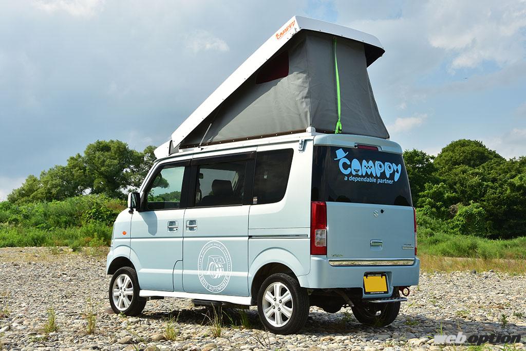 取材車両はスズキのエブリイ(DA64W/DA64V)がベース。このルーフ部をポップアップ化することで、親子2人分の就寝スペースを確保。室内は助手席側の後部がフラットになり、大人が余裕で足を延ばして寝られるほどの広さとなっている。
