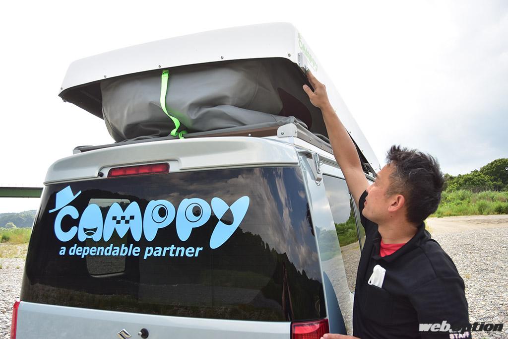 ポップアップルーフは本体左右のラッチを外すだけで、ガスダンパーによって自動展開する。わずか数十秒で基地の完成だ。