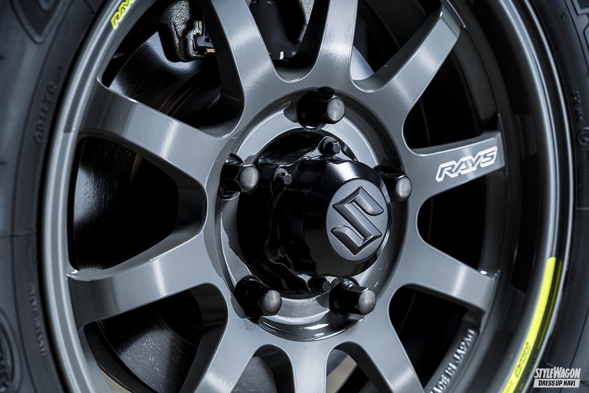 そんなロービジカラーを21年の限定色として採用してきたのが、ジムニーのために開発された本気のレーシング鍛造、AラップJ。本格的な4WDマシンにも引けを取らない走行性能を持つジムニーのために、ジムニー用ホイールでは最軽量となる4.8㎏で仕上げられたライトウェイトフォージド。軽さだけでなく強度、剛性面でも他を圧倒することができる、戦えるジムニー専用モデルだ。
