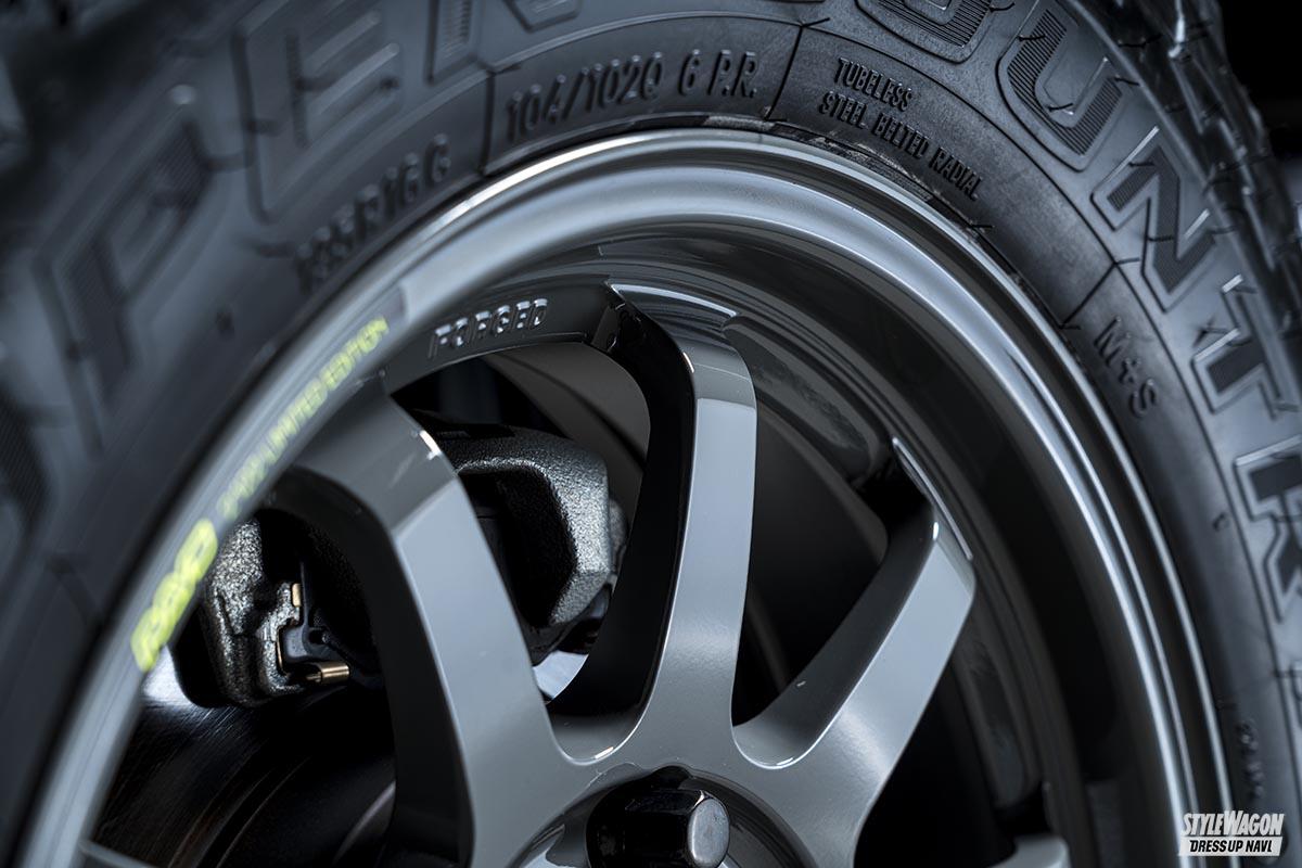 ノーマルのジムニーでももちろん履けるが、オーバーフェンダーサイズやシエラ用サイズが設定されるのも魅力。過激な装いにも対応可能だ。