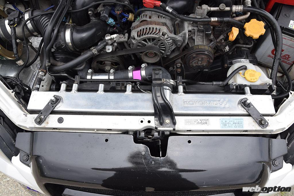 ラジエターは、BP型の純正より厚みがあって冷却効果の高いBE型レガシィ用のコーヨー製アルミラジエターを流用。そのまま装着するとアッパーホースがベルトに当たってしまうため、ホースレイアウトを短縮することで回避。そこにスイッチ制御の強制電動ファンを組み合わせて、高負荷状態が続いても音を上げない環境を整えている。なお、水温に引っ張られて油温も下がるためオイルクーラーは装着されていない。