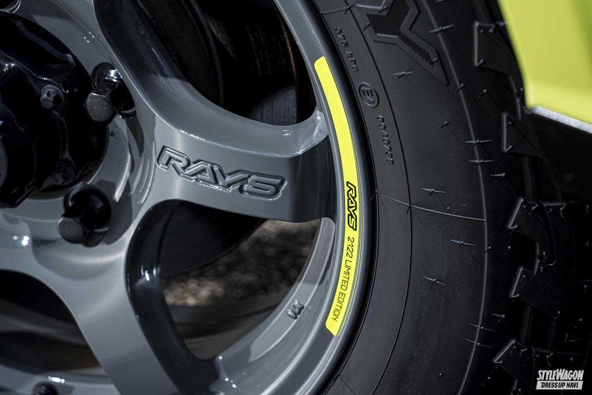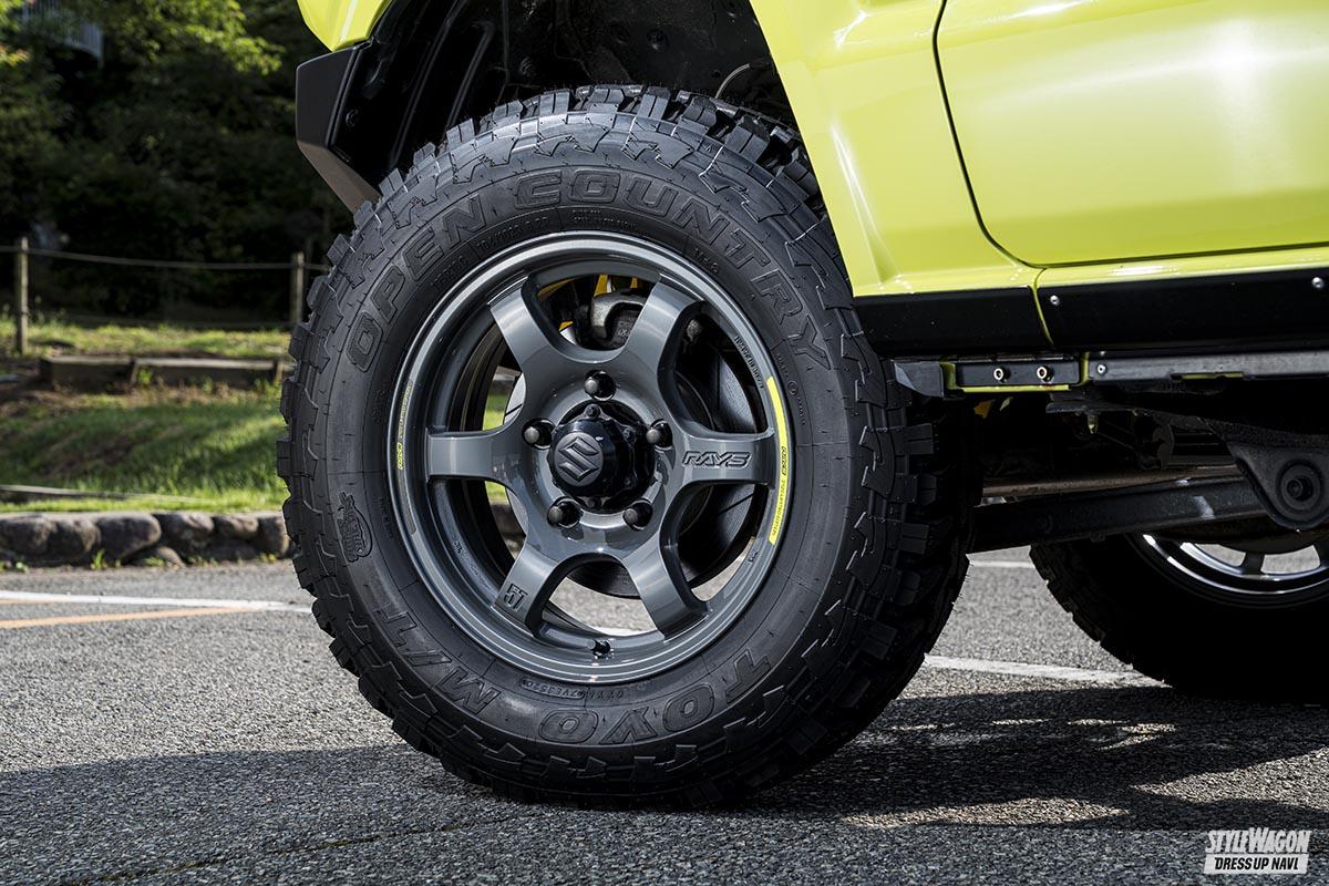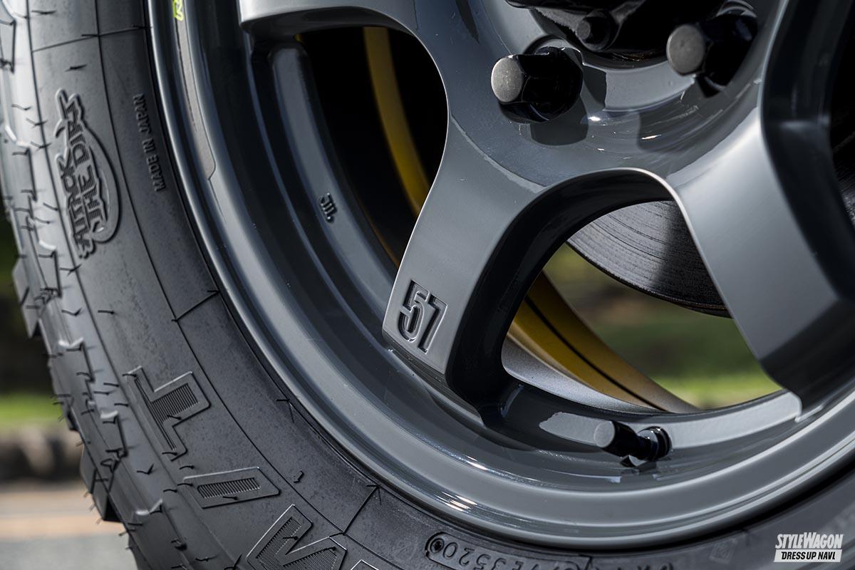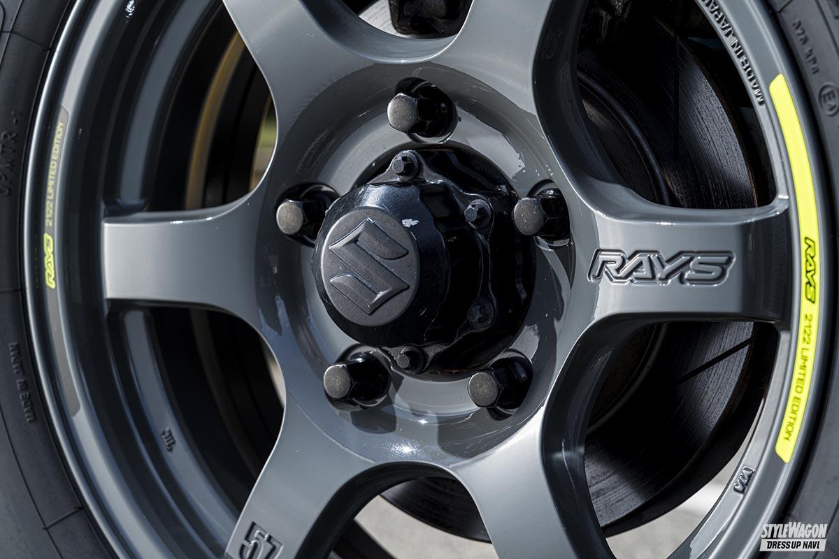 そんなジムニーで楽しめるラージP.C.Dのひとつが、57DRーX。レイズ伝統の6スポークを継承しながら、ジムニーなどの走りに寄与できるよう、各部の贅肉を削ぎ落とした高性能モデル。履けば当然スポーツ度が上がり、力感もグッと強められる。