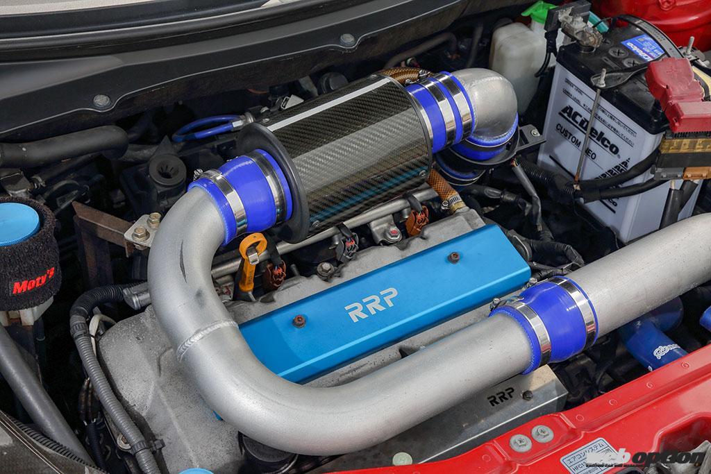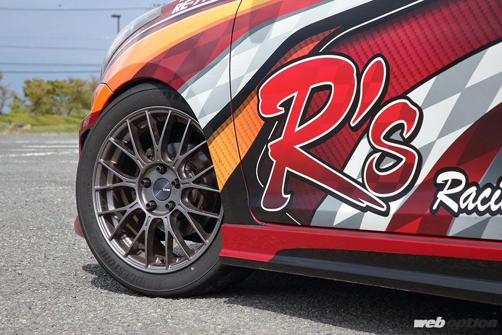 足回りはオリジナルダンパー(F10kg/mm R12kg/mm)を軸にセットアップを進め、機械式LSD(2WAY)とのマッチングを図りながらサーキットから街乗りまで幅広いキャパシティを実現する。ホイールはエンケイのPFM-1(FR7.5J)で、タイヤには225/45-17サイズのポテンザRE-12Dをセット。
