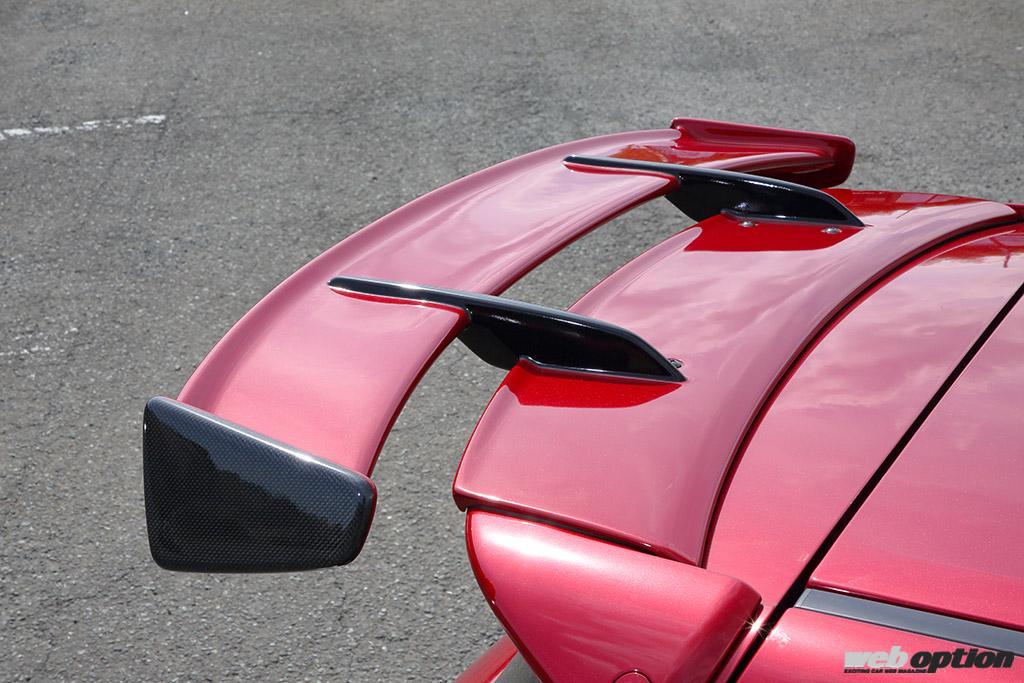 エクステリアもアールズのRRPハイパフォーマンスエアロシステムでフル武装。中でも特に人気だというのがアグレッシブなデザインが特徴のリヤウイング。高速域やブレーキング時にリヤの挙動を安定させてくれる高機能パーツだ。