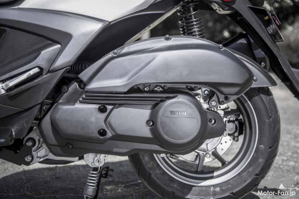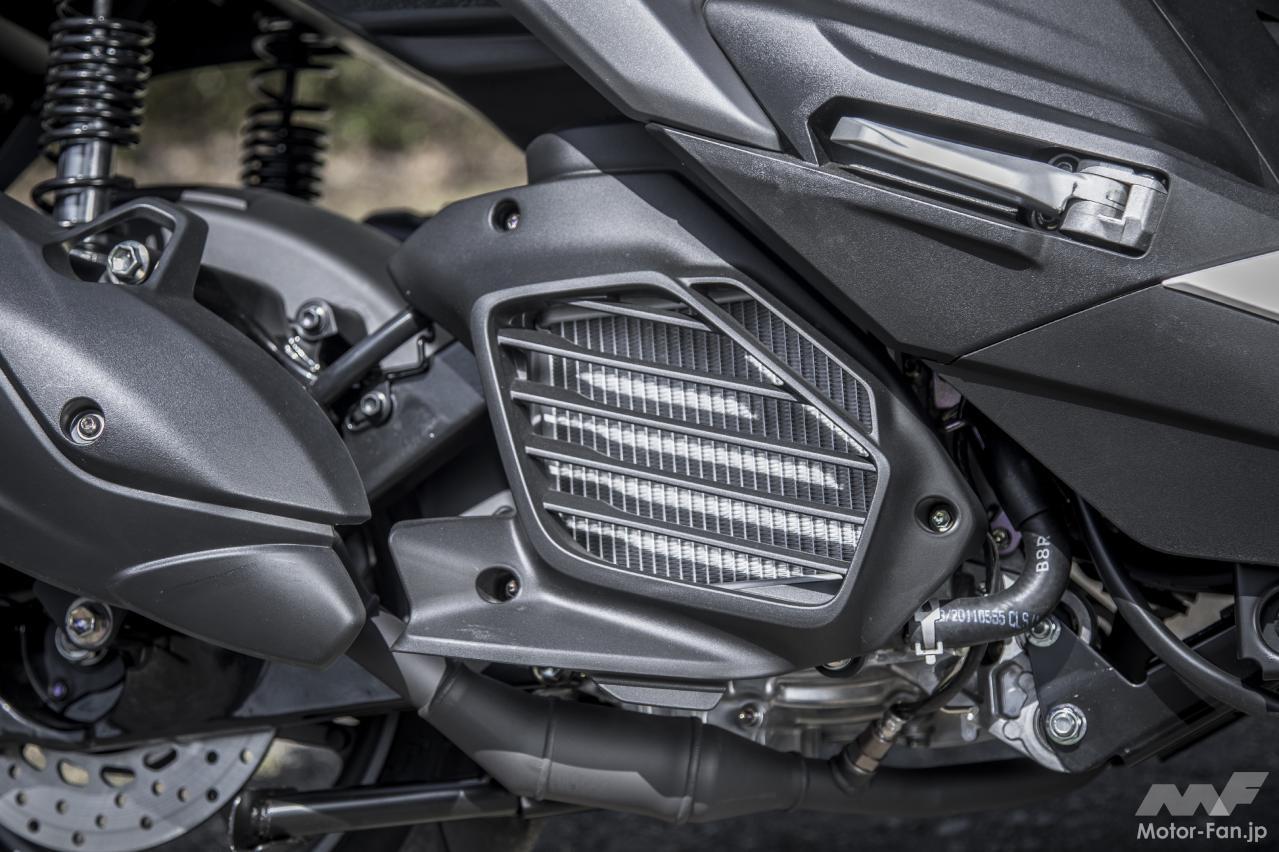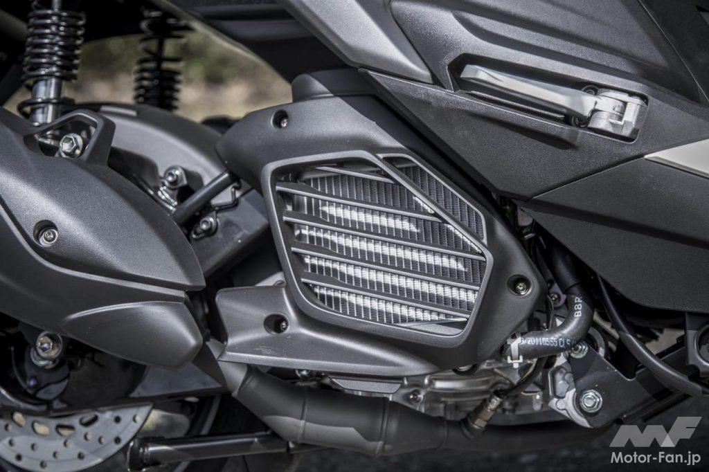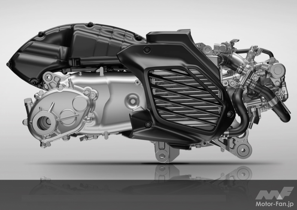 現行シグナスXとの比較で明確に異なっているのは冷却方法の水冷化、ボアストロークの一新(ボアは52.4→52mmへ縮小、ストロークは57.9→58.7mmへ延長)。そしてVVA(バリアブル・バルブ・アクチュエーション)機構を搭載。