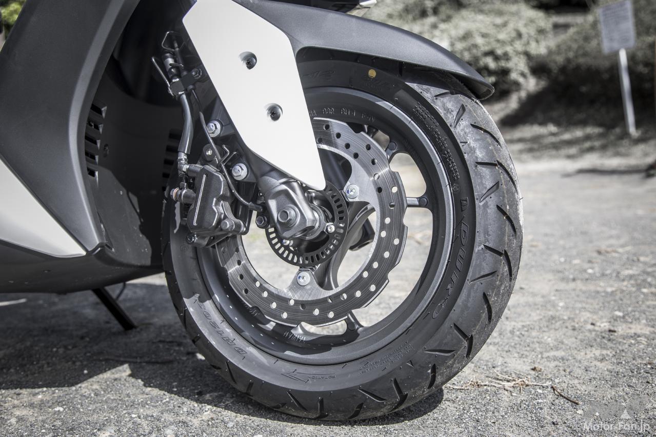 早速試乗車に股がると、これまでの標準的な12インチホイールを履く原二スクーターと比較すると、車体はやや大きくなった感は否めない。車重もシグナスX比較で4kg増の123kgある。