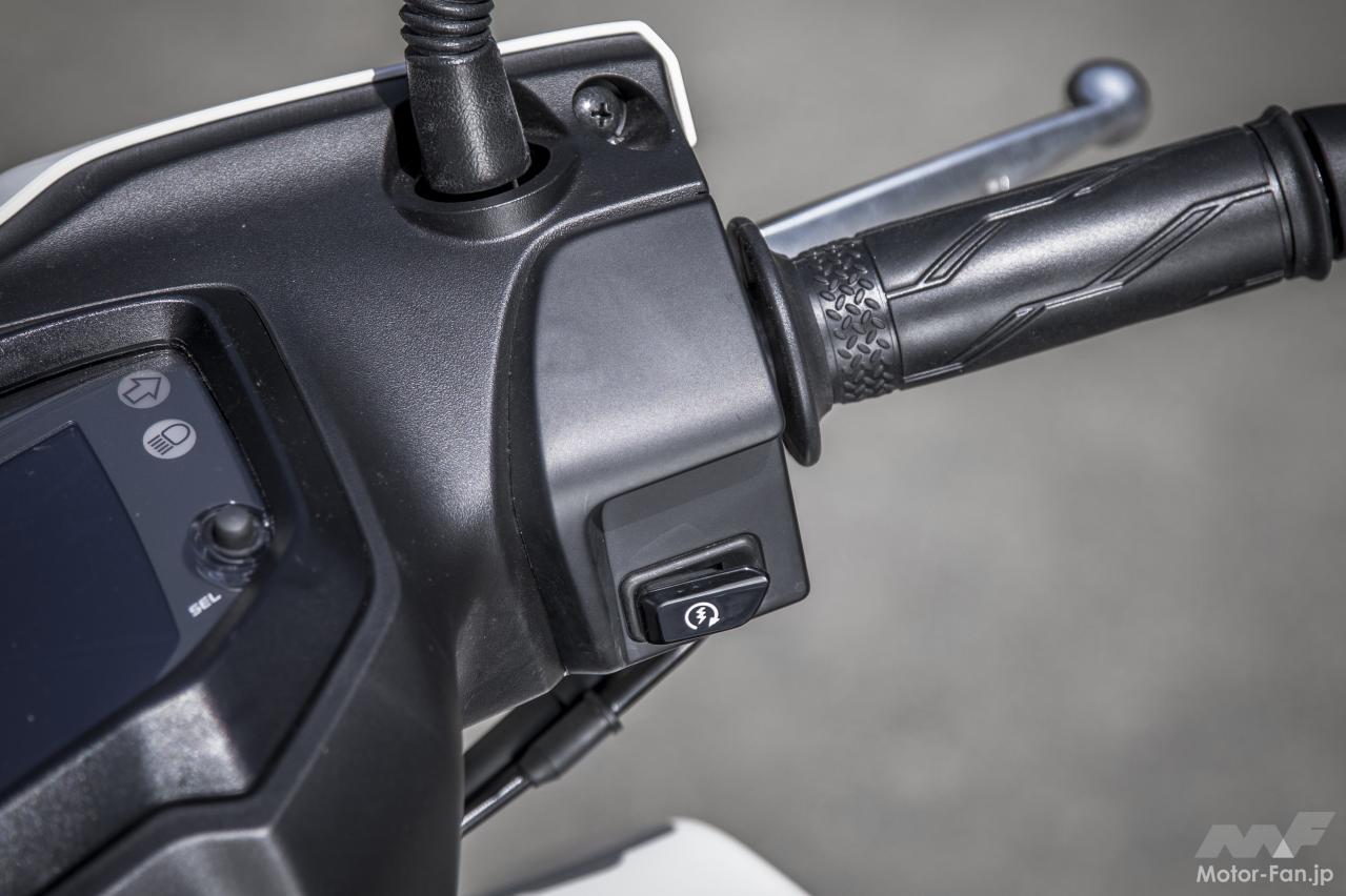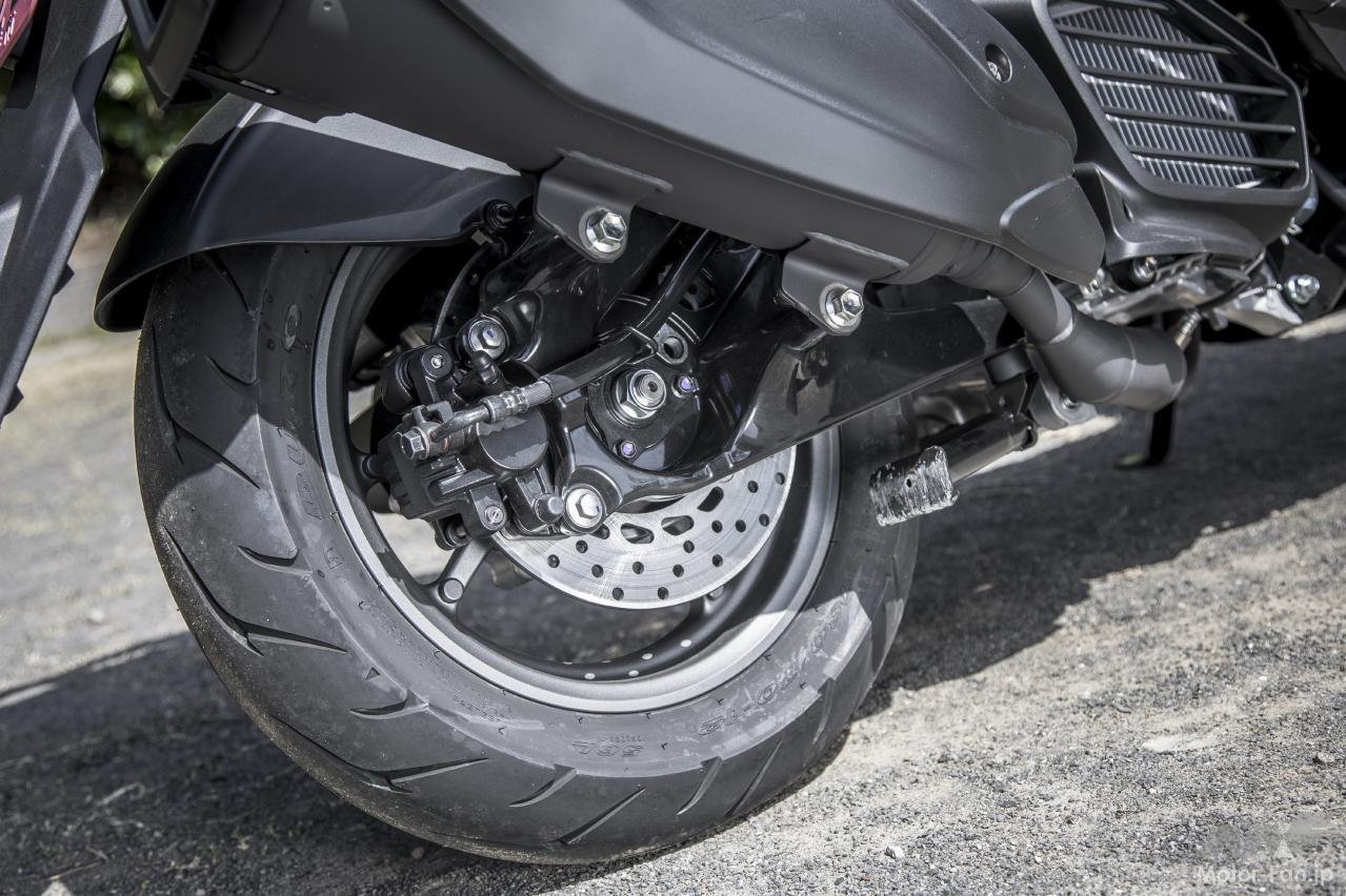 手動ブレーキは前後連動式なので、左側のレバー操作だけで前後輪がバランス良く制動されて滑りやすい路面でも急制動をかけられる安心感は大きく、ドライな舗装路を走る限り、こうしたスクーターではABSよりも好印象を覚えたのが正直な感想である。