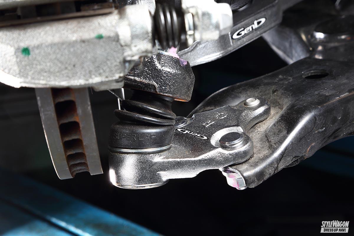 ロアアームへリンクがセットされているリアと異なって、フロントはリンクがダンパー部分へセットされているのだが、ローダウンした影響でスタビライザー両端に不要な力をかけてしまっているケースは多い。そのため、リアと同様にフロントのスタビライザーリンクも最適な位置関係となるように調整式構造の専用品で補正すべき。全長の長さゆえに最適長だけでなくタフネスさも必要となる補正ポイントだが、軽量・高剛性なアルミ鍛造仕上げとなるゲンブのアジャスタブルスタビリンクなら、その点も含め安心して投入できる。価格●3万9180円