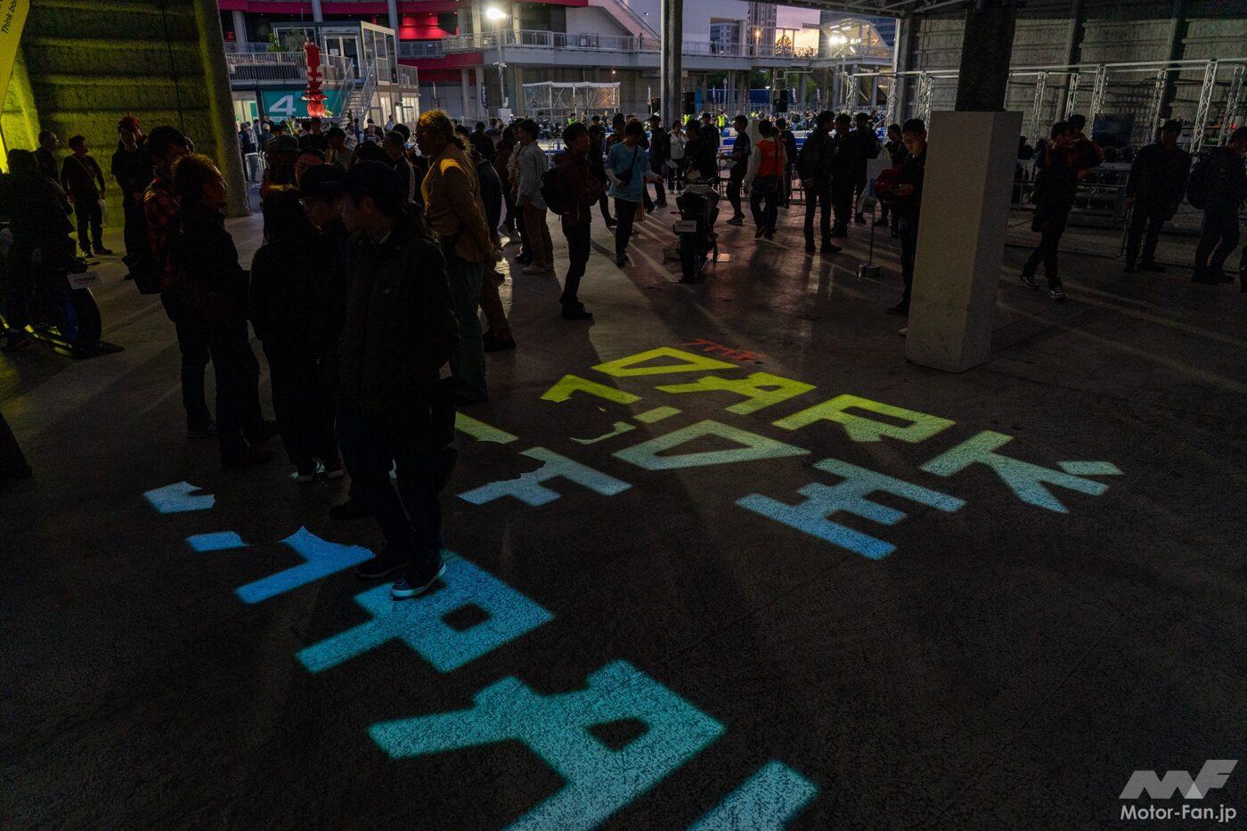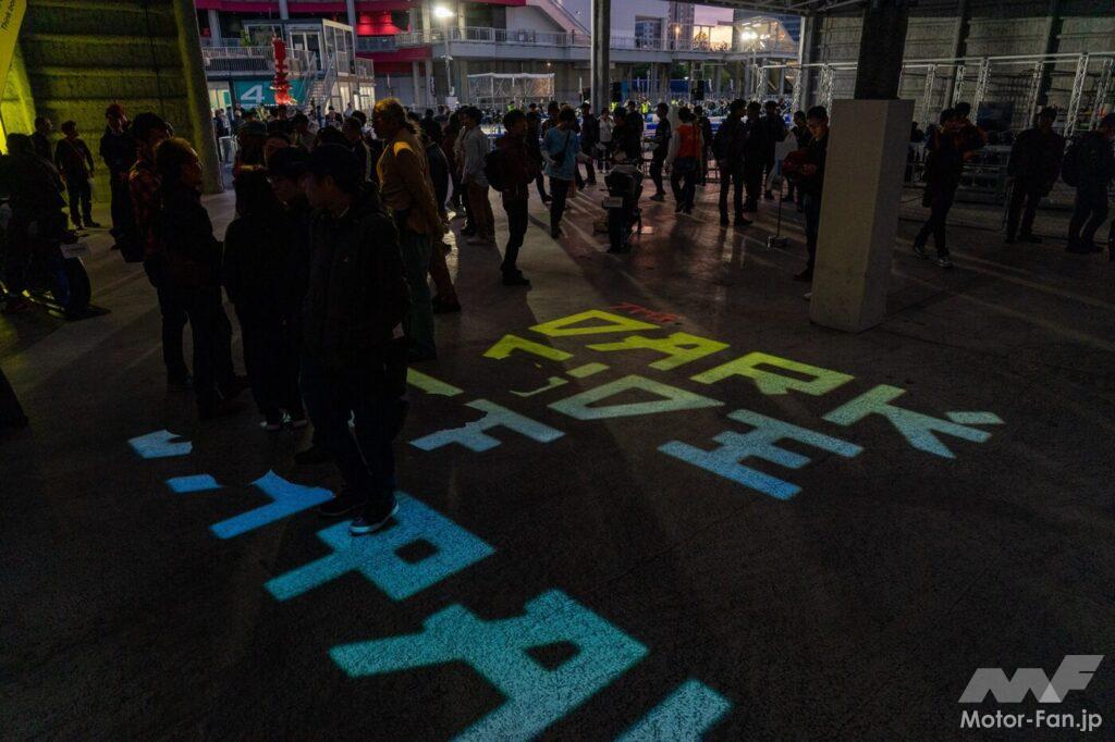 展示車両エリアでは、マシンのまわりや地面に、「The Dark side of Japan」の世界観を表現した映像が映し出すプロジェクションマッピングが実施され、夜のイベントならではの演出を来場者は楽しんだ。