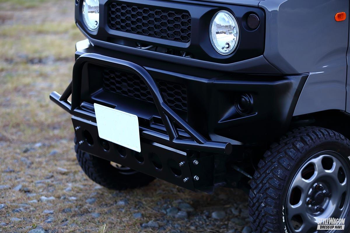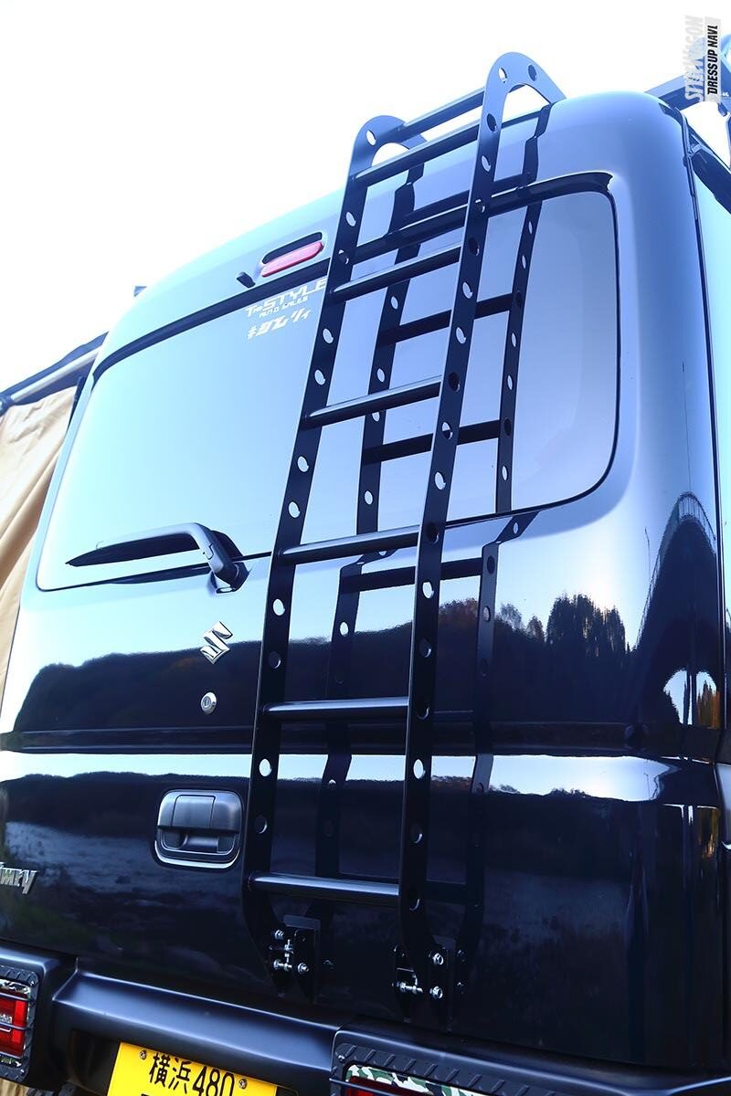 なにより4インチというリフトアップ量からしてオフロード能力の向上は一目瞭然だが、更にはジムリィフェイスキットに加え、アイアンバンパーガードやサイドパイプ、ルーフキャリアやラダーでタフなイメージと実用性も確保したかなりレベルの高いカスタムプランだ。