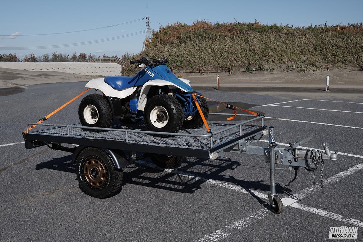 まず圧巻なのが、デモカーがけん引している大きなトレーラー。このトレーラーを接続するためのヒッチメンバーこそ、フォレストオートが開発したビルトインヒッチメンバー。バンパーの下から出すと輪留めなどにヒットしやすいが、ナンバープレート取り付け部から出す手法を採用することで干渉のリスクを避けられる。