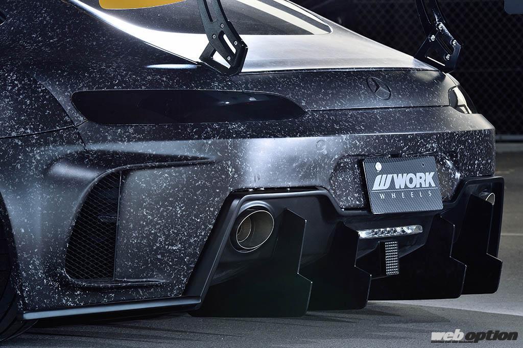 大型のダクトが設けられたリヤバンパーと、巨大なフィンが特徴的なリヤディフューザーもカルボネール製。レーシングカーさながらの威圧感ある雰囲気を醸し出す。