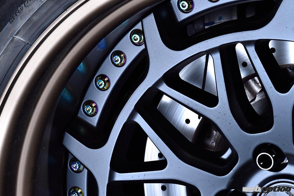 ホイールはワークグランシーカーDMXのカスタムオーダーモデル。マットブラックのディスクに艶消しブロンズのリム、チタンコートピアスボルトという組み合わせだが、こういった細かい指定ができるのも3ピースホイールの強みであり、ワーク製品の特徴と言える。ちなみに、車高はダウンサスを用いて下げられているが、これは純正ダンパーの出来が良すぎて車高調を投入する必要がないと判断したからだ。