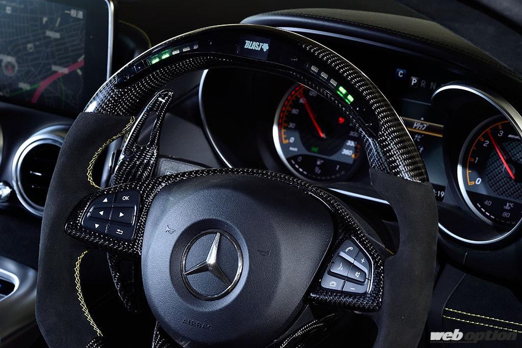 そんな素材をベースに、ブラストはまずスタイリングから攻めた。ポーランドのブランド“Carbonerre(カルボネール)”と正規輸入代理店契約を締結し、同社の片側50mmワイドのボディキットを投入。さらに、トレンドとなりつつあるフォージドカーボン仕様のシートでボディ全体をラッピングして独特のスタイリングを構築している。