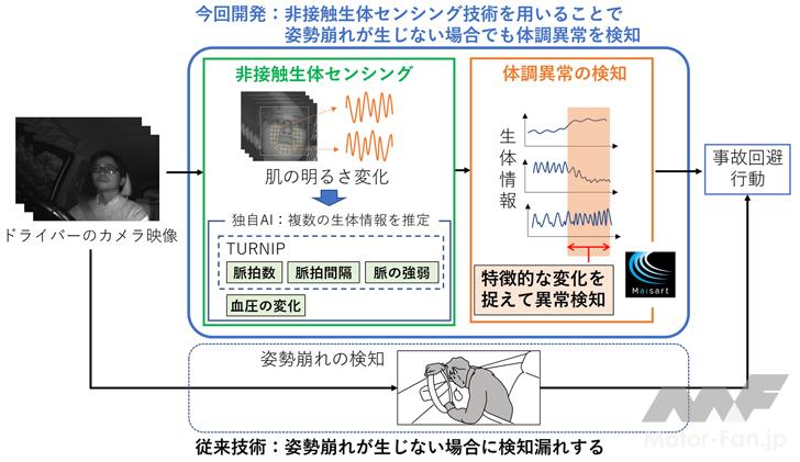 三菱電機はこれまで、体調異常時に生じる生体情報の変化に着目した検知技術の開発に取り組んできた。今回「心疾患」「てんかん」「脳血管疾患」で生じる「脈拍間隔の変化」や「血圧の変化」などの生体情報の特徴的変化に着目し、当社独自のAIの活用によりDMSのカメラ映像から非接触でドライバーの生体情報(脈拍数、脈拍間隔、脈の強弱、血圧の変化)を推定。その生体情報の変化から、姿勢崩れが伴わない場合でも体調異常を検知する技術を開発した。さらに体調異常発生による姿勢崩れの前に生体情報が変化した場合は、体調異常の早期検知により事故回避行動の早期実施が期待されている。