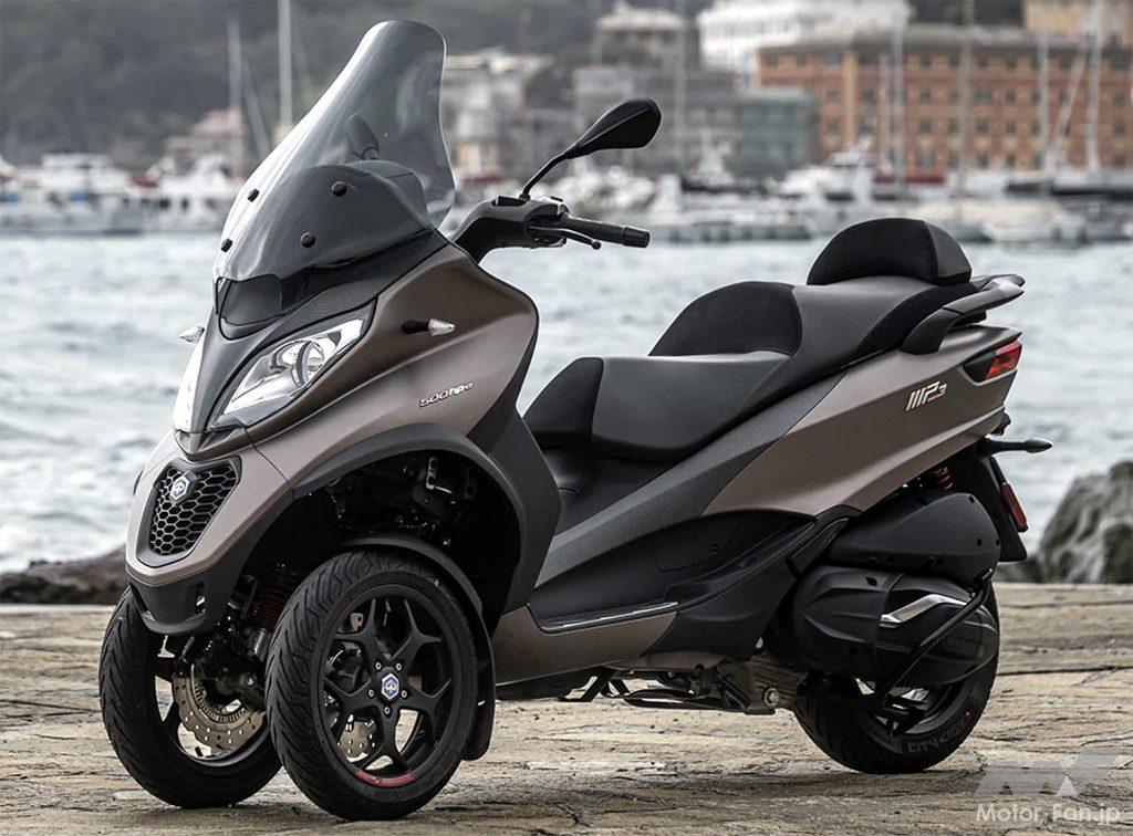 写真は現在イタリヤ本国で市販されているMP3 Sport Advanced 500 Euro 5。車体を傾けてコーナリングできる前2輪後1輪の3輪ビークルで、ヤマハ・トリシティと同種の乗り物。このカテゴリーのパイオニアである。500はリバースギヤも装備された同社のフラッグシップモデルである。