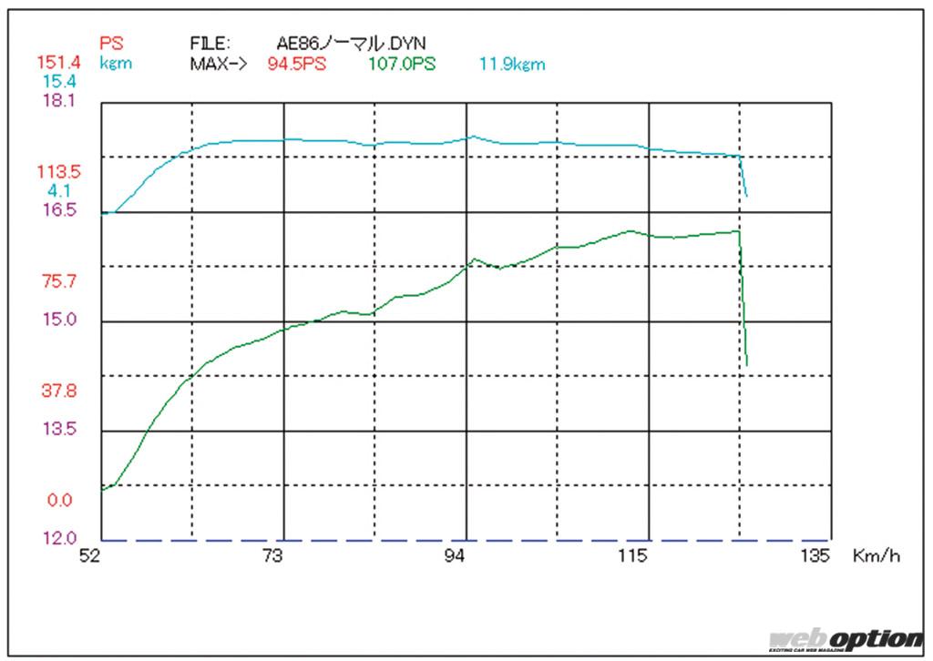 ダイレクトイグニッション化の効果は絶大。TMワークスの社内テストでは、最高出力が2.7ps、最大トルクが0.4kgmの向上を確認。パワーカーブも非常に自然な曲線を描いている事が分かる。