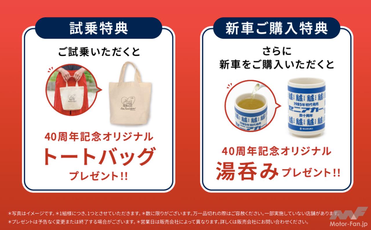 キャンペーンは「40周年ありがとうキャンペーン」と題して、今年12月末まで実施。試乗すると40周年記念オリジナルトートバッグを、そして新車を購入すると40周年記念オリジナル湯呑みをプレゼント!