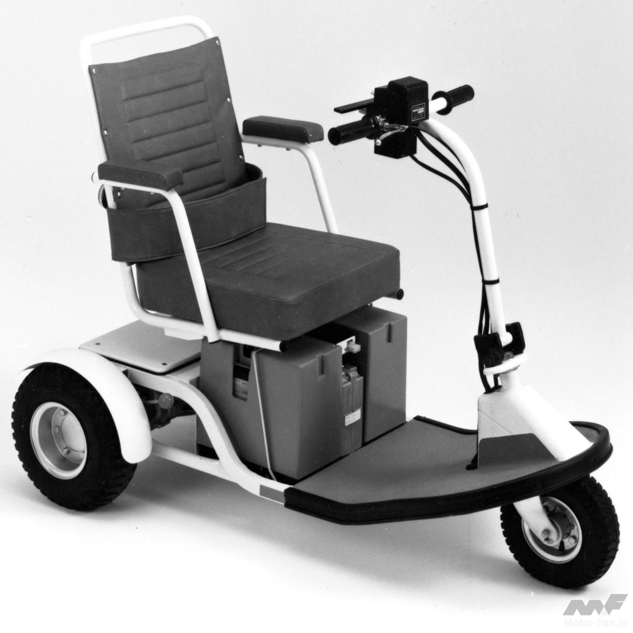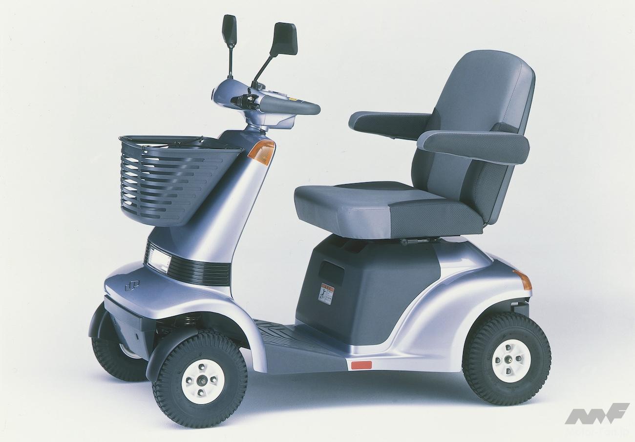 1985年10月に発売された初代セニアカー 電動三輪タイプ「スズキセニアカーET10型」は、高齢化時代を迎えるなかで、高齢者の方や足の不自由な方のために、歩行者並みの安全な速度で歩道を走行する乗り物として開発された。