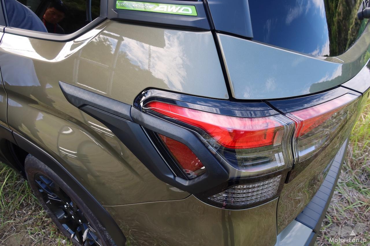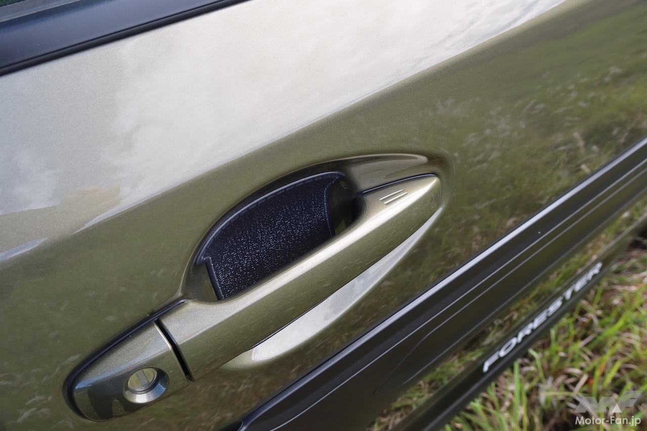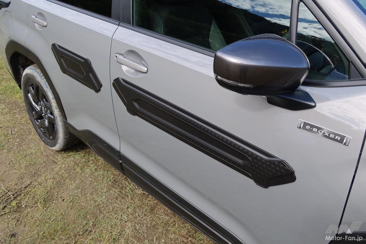 フロントとリヤのランプからボディサイドに回り込む部分に装着する硬質ゴム製のランプサイドプロテクターは、新型フォレスターから導入したアイテム。マウンテンバイクやロードバイクを立て掛ける際の保護としての役割を想定すると同時に、立て掛けやすさにも配慮した形状にしているという(硬質ゴム製なので、そもそも滑りにくい)。スキー板やスノーボード、あるいは釣り竿を立て掛けるのにも便利だ。