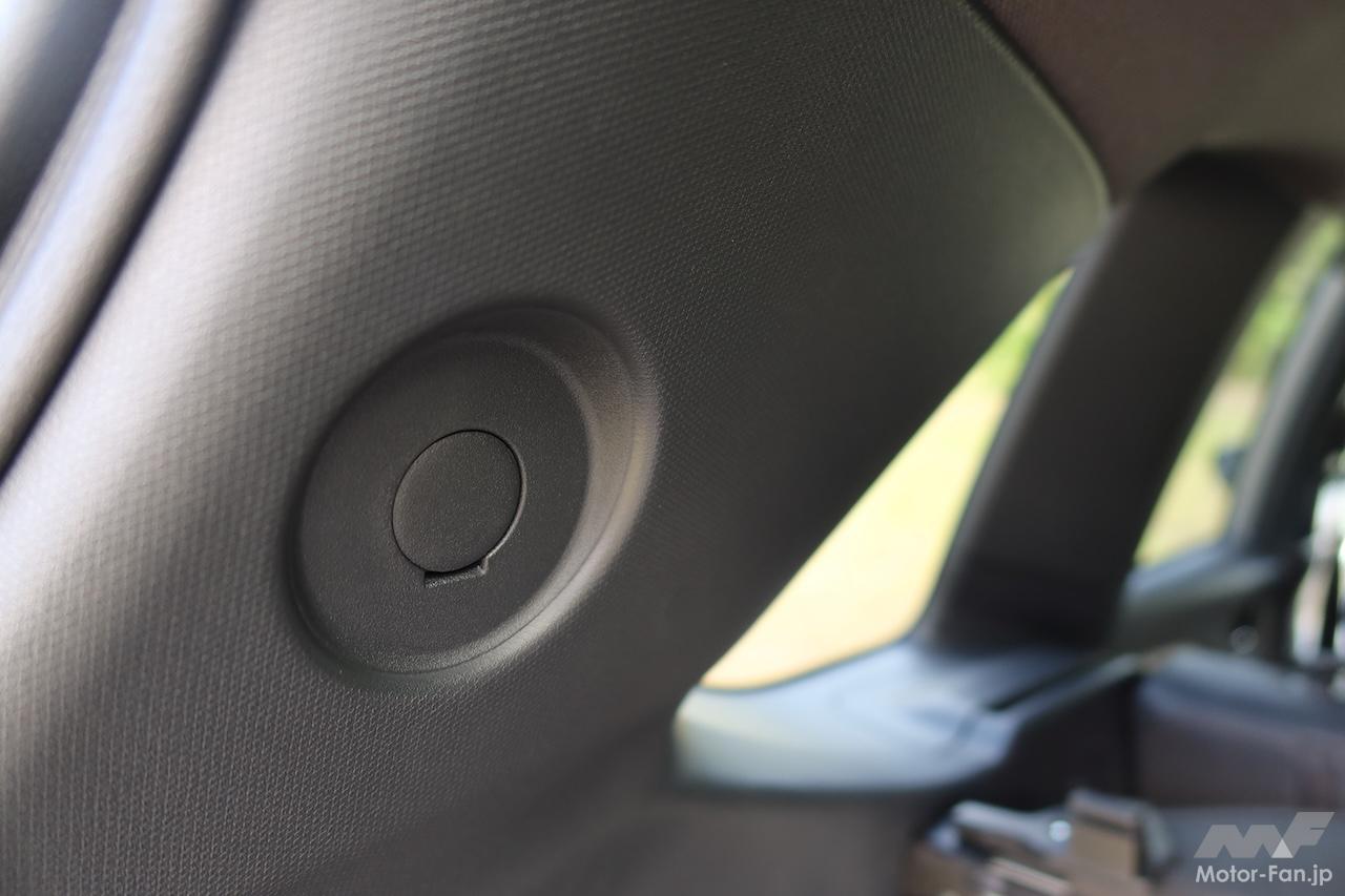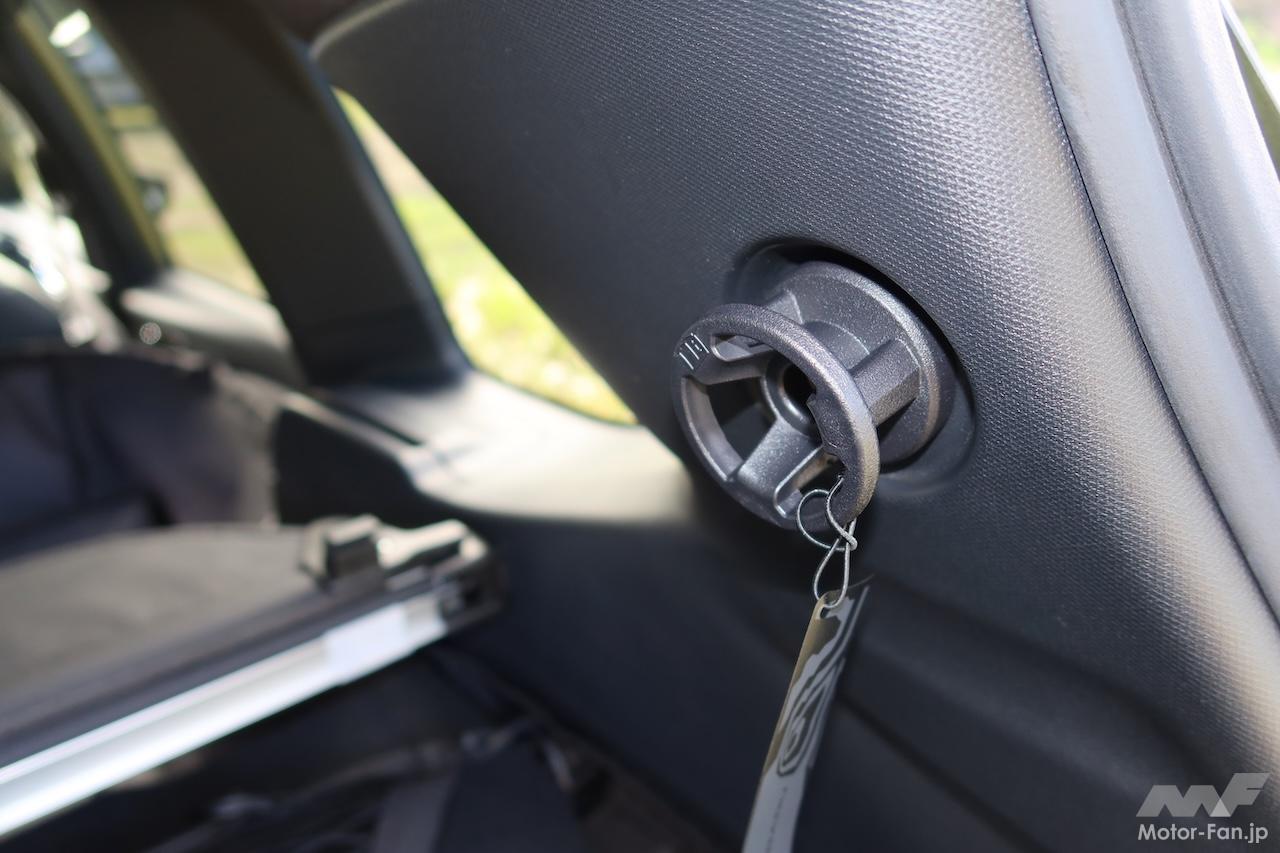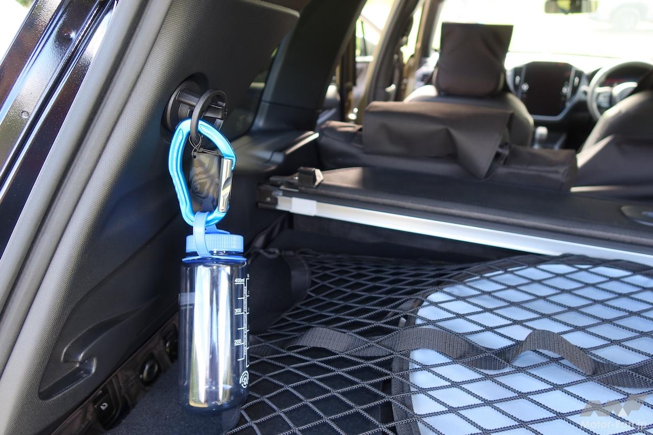 感心したのはユーティリティフックだ。ラゲッジルームには片側に3ヵ所、フックが取り付けられるようになっている(アクセサリー非装着時は該当部分にカバーがはめ込まれている)。立体的なホイール形状のフックは専門店で売っている本格的なカラビナから、100円ショップで売っているものまで、いろんな角度から簡単に引っかけられるように考えられた優れものだ。