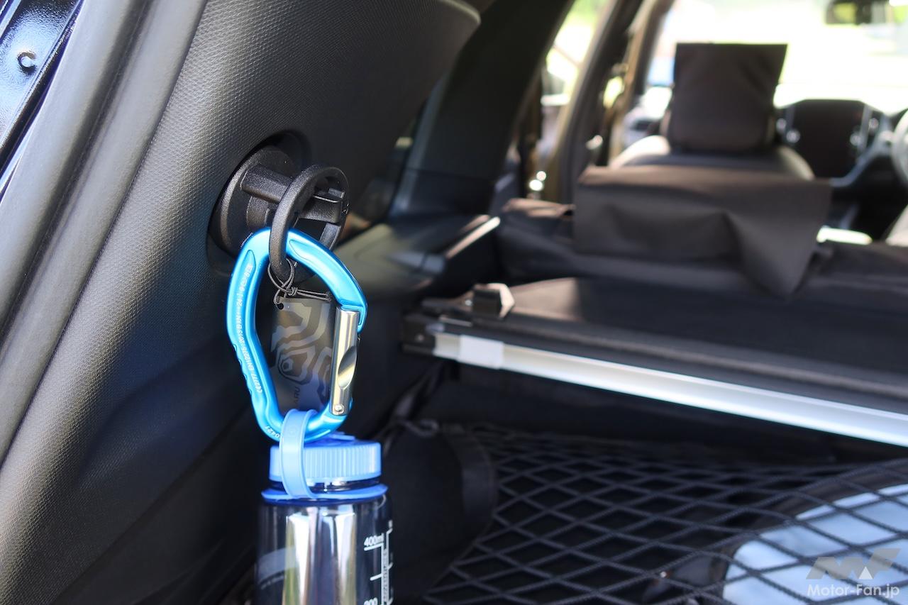 ボディサイドプロテクター(樹脂製)は活用事例が示されていた。プロテクターは四隅に溝が切られており、ここに好みのパラコード(アウトドア用品店などで扱っている)を引っかけることでタオル掛けとして使うことができる。サングラスを引っかけるのもいいだろう。