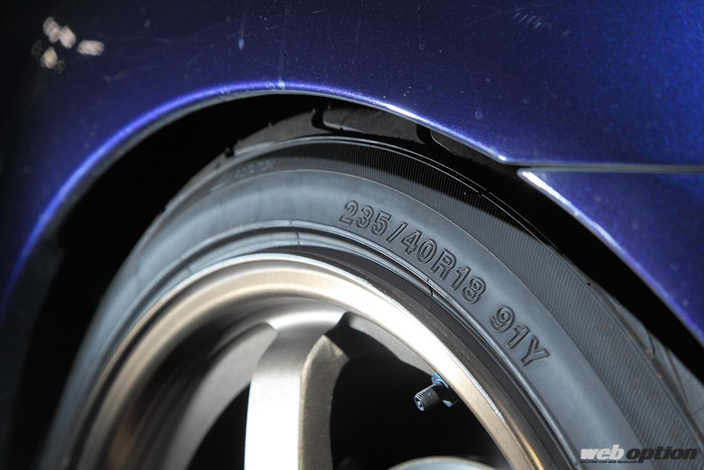 ボルクレーシングTE37(FR9.0J)に、前後同サイズのアドバンネオバAD08(235/40-18)をセット。ブレーキはフロントがapレーシングキャリパーキット+プロジェクトμSCR-PROローター、リヤがノーマルキャリパー+SCR-PROローターという組み合わせ。ファイナルは4.7だ。