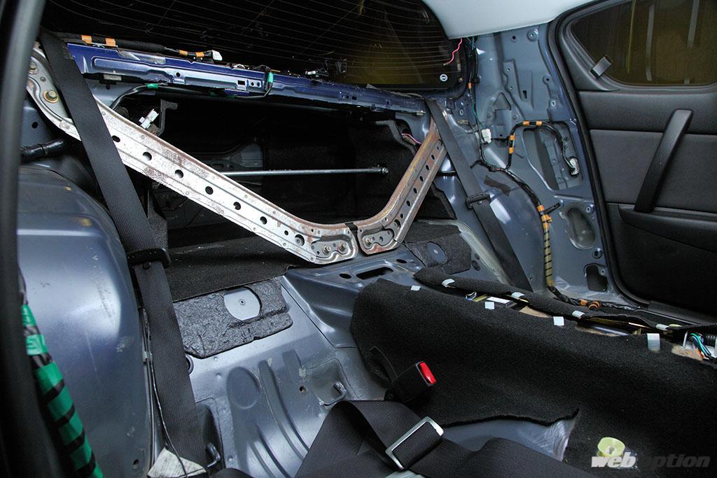コクピット周辺はナルディクラシックを導入した程度のシンプルメイク。一転、リヤ周りはシートからパネルに至る全ての内装パーツを撤去し、2シーター化を敢行している。