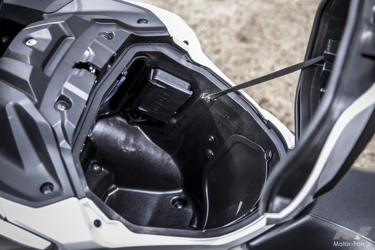 シート下のラゲッジスペース容量は、前モデルのフレーム形状を見直すことで22Lに拡大。ラゲッジスペース内には荷物の確認に便利なラゲッジライトとUSBソケットを標準装備し、日常での使い勝手を向上。