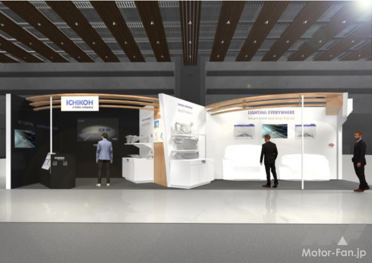 市光工業では次世代の自動車を彩る、未来志向の革新的なフロントフェイスが展示される。電動化と自動運転車両に向けた市光工業のインテリジェントなライティングのコンセプトにより、グリル・バンパーにまで及ぶライティングは、意匠性の差別化とドライバーの視界の改善はもちろん、道路利用者とのコミュニケーションを促進し、安全性の向上にも寄与する。HD ライティングによるグレアハイビームや路面描画などの先進機能に加えて、薄型のヘッドランプや長尺の信号灯を搭載することで、最新のスタイリングトレンドに沿ったデザイン性も兼ね備えている。さらに、広範囲にわたるライティングにより、光の動きで車両の動きや危険を周囲に知らせ、安全面においても一歩先を行く製品となっている。また、マイクロLED を使用したディスプレイにより、車両の充電状況やメッセージをわかりやすく表示することもできる。