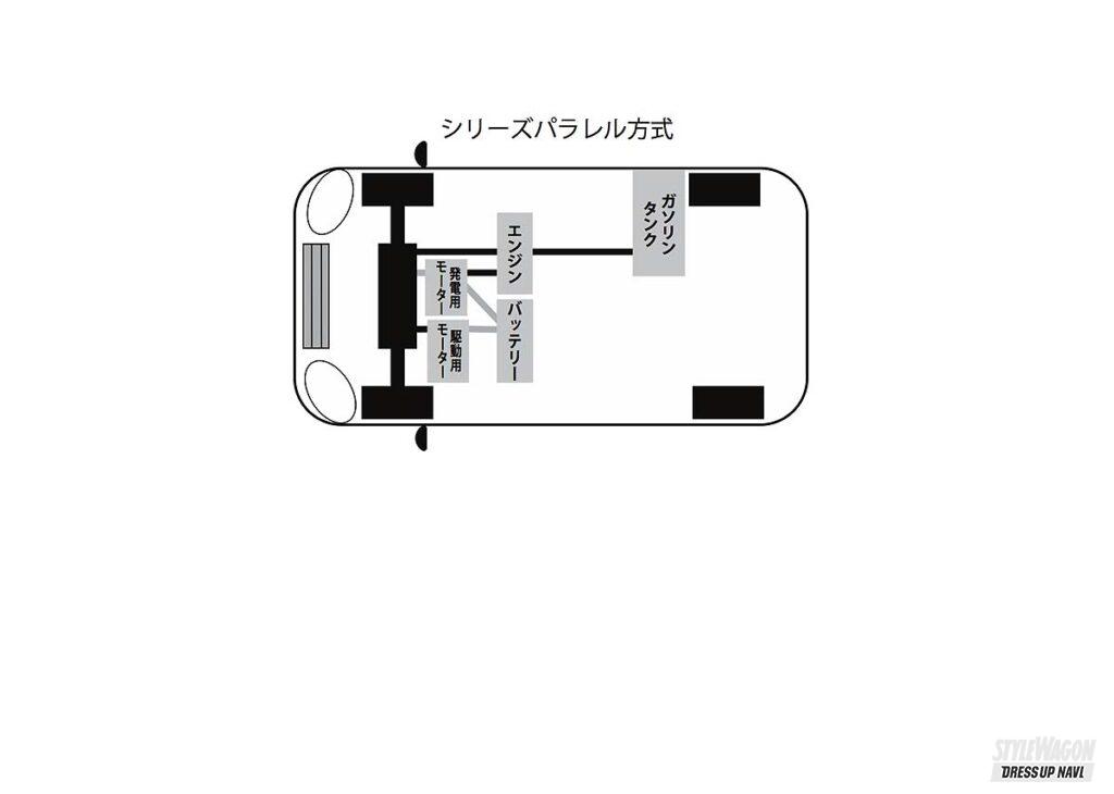 パラレルとは、並列という意味合い。タイヤが回る駆動力を発生するのはエンジンが主体で、必要に応じてモーターがアシストします。主に発進からの加速時や、高速道路での追い越し加速などのシーンで、ドライバーはモーターの存在を感じます。メリットとしては、パワートレイン全体のシステム構成がさほど複雑にならないため、メーカーとして導入コストを抑えることができます。日米欧などメーカーがこれまでさまざまなタイプのパラレルハイブリッドを展開してきました。そうしたなかで、エンジンとモーターとの連結方法でメーカー独自の技術を導入し、他社との差別化を図ってきていて、パラレルと単純に表現できないモデルが増えている状況です。