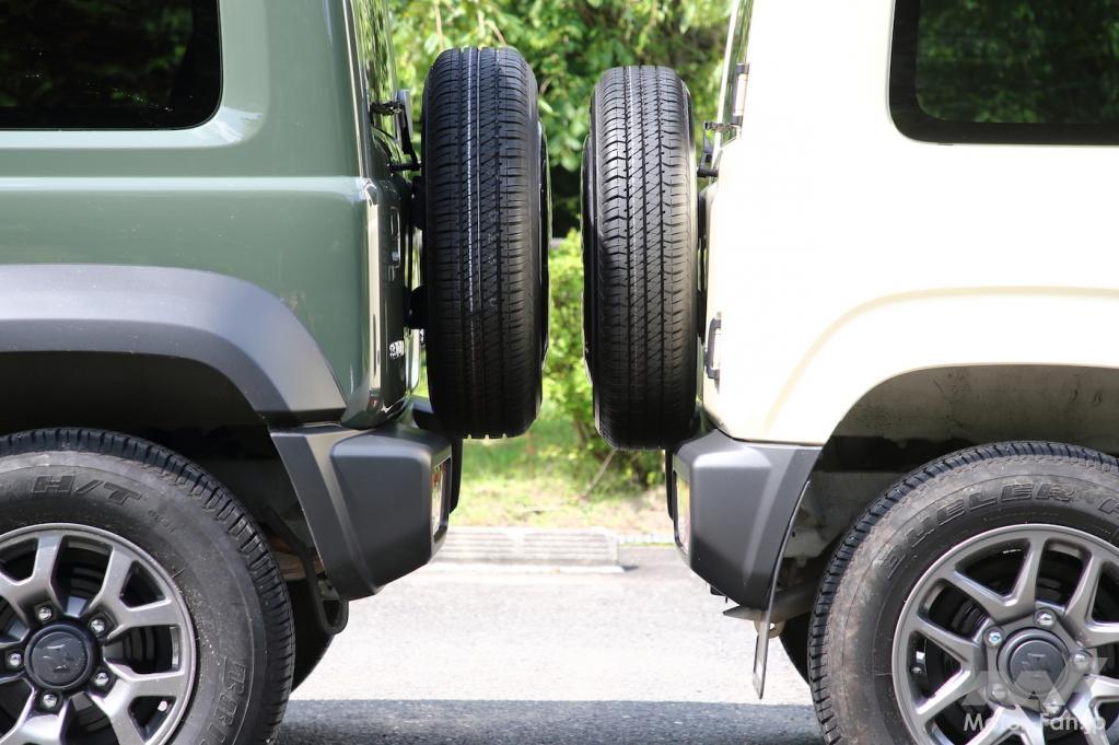 リヤ周りにも結構な差異が現れた。先述のようにタイヤ外径が異なるため、両車の高さがそろっていないことが写真からは判断できる。リヤバンパーもフロント同様に形状が異なっていて、特に前後寸法の違いが大きい。数字はリヤドアの平面部から最後尾までの採寸。加えて、スペアタイヤの張り出し寸法も測り比べてみた。