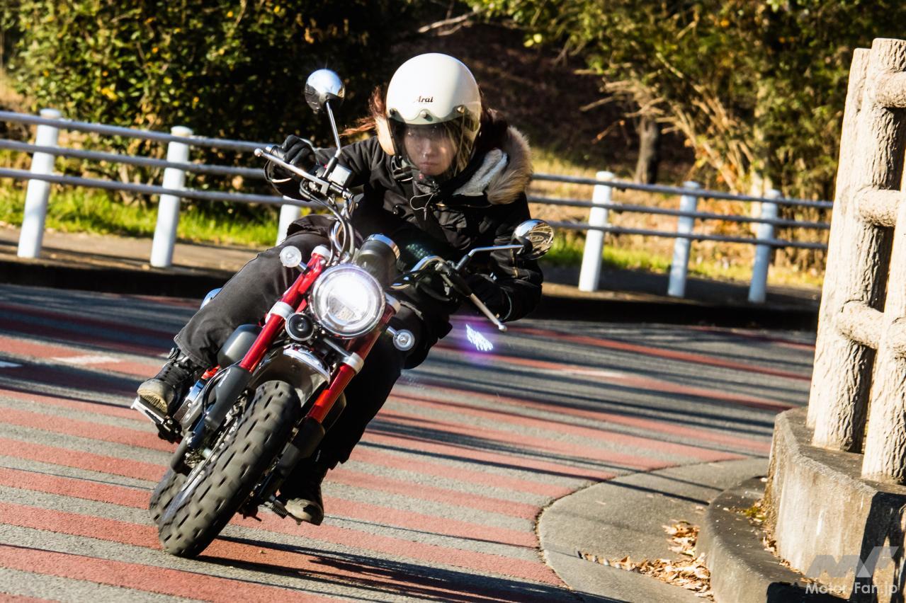身長164cmの私なら、モンキーはベッタリらくらく良好な足つき性です。見るからにコンパクトなマシンですが、ハンドルバーのレイアウトにはゆとりがあり、自然にアップライトなポジションになるため、大柄な男性が乗ってもけっして窮屈ではありません。