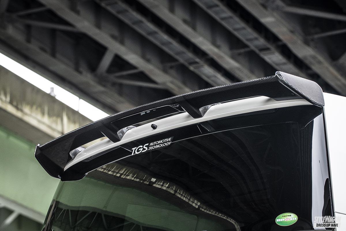 バンパーまわりのエアロは少ないが、ウイングはいくつか選べるデリカ。デザインも様々で、リアラダーとの併用が可能な実用モデルもあり。ルーフスポイラーとも呼ばれる。
