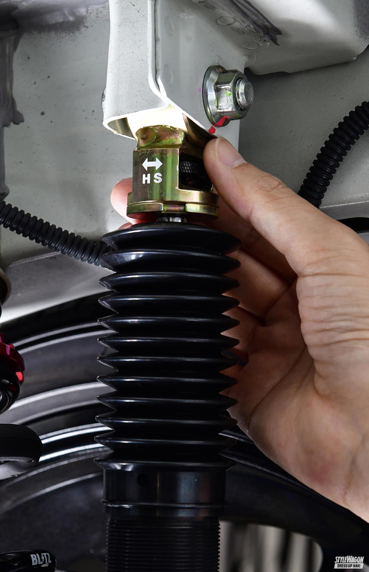 フロント側の調整ダイヤルは、車内からアクセスできる。パネルを外す必要はあるが、小まめに調整するのも手間ではない。付属のレンチでダイヤル部の固定ができるのも特徴。リアの調整ダイヤルは上側に着く。ジャッキアップすればアクセスしやすいが、でも『DSCプラス』対応が待ち遠しい。