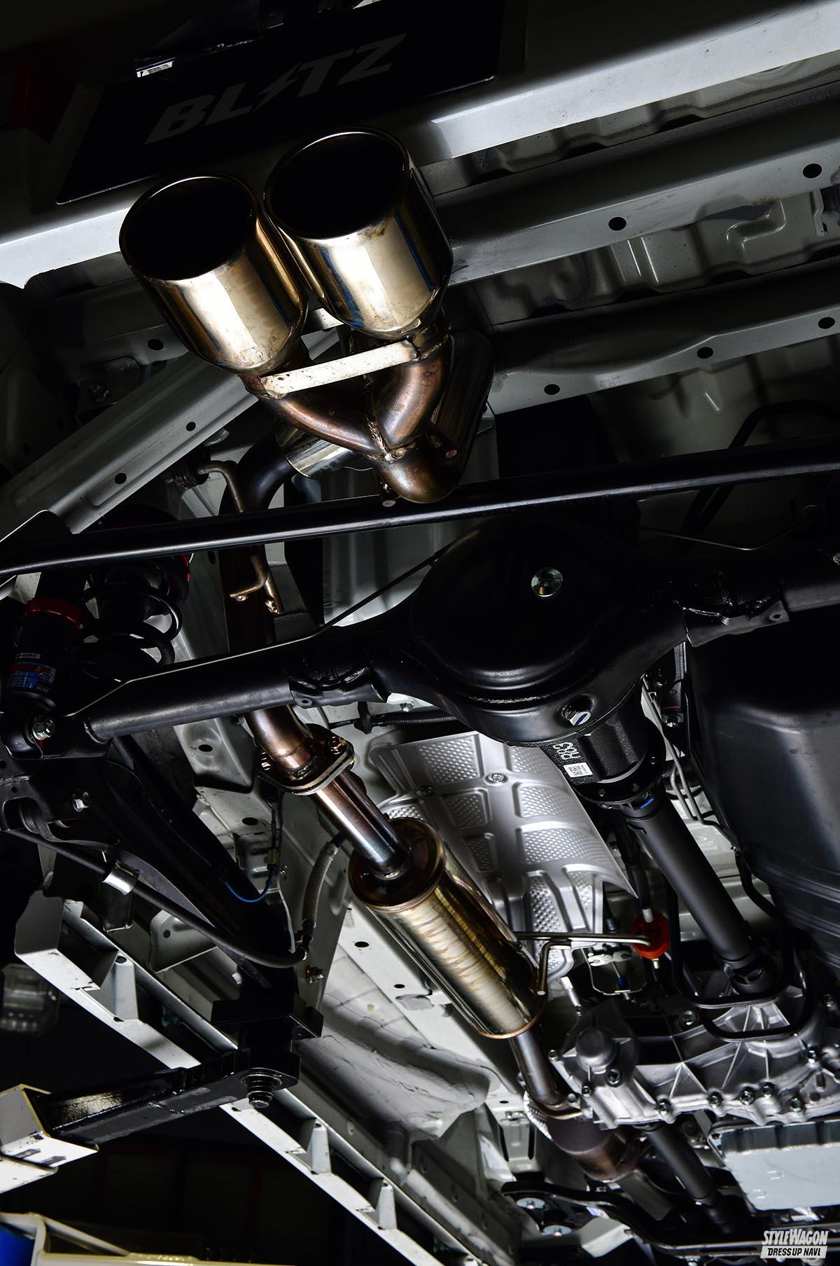 車高調の設定は、前・後=35mm・46mmのローダウン。上下とも調整幅は残るが(前・後=-65~0・-65~-30で調整できる)、バランス良い姿勢と言えよう。マフラーは純正バンパーを活かしたセンター出し。オーバル形状なので地上高も十分。“使える”マフラーだ。