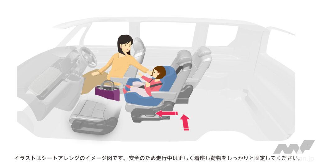 パッケージングの面では、家族の成長に合わせた多彩な使い方ができるよう、乗る人が自由に居場所を選べるシートアレンジを採用した。2列目シートは、前後へのロングスライドだけでなく左右にもスライドできる構造とされた。これにより、例えば小さな子どもは1列目から目の届きやすい場所に、成長とともに適度な距離感を持って座るなど、柔軟で自由な使い方が可能となる。3列目シートは、好評を得ている床下収納はそのままに、着座位置を高くし、前方のシート、ヘッドレストの形状を変更したことで開放的な視界を実現。シートクッションの厚みも増すことで、3列目においても快適な座り心地を実現している。