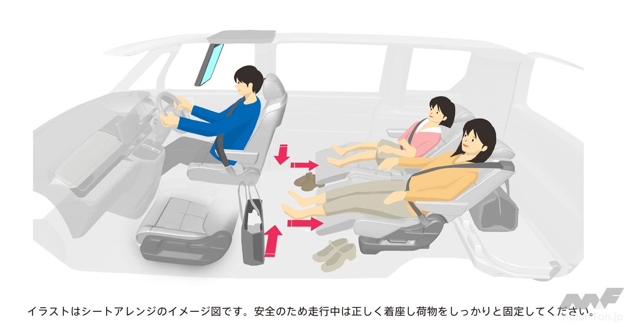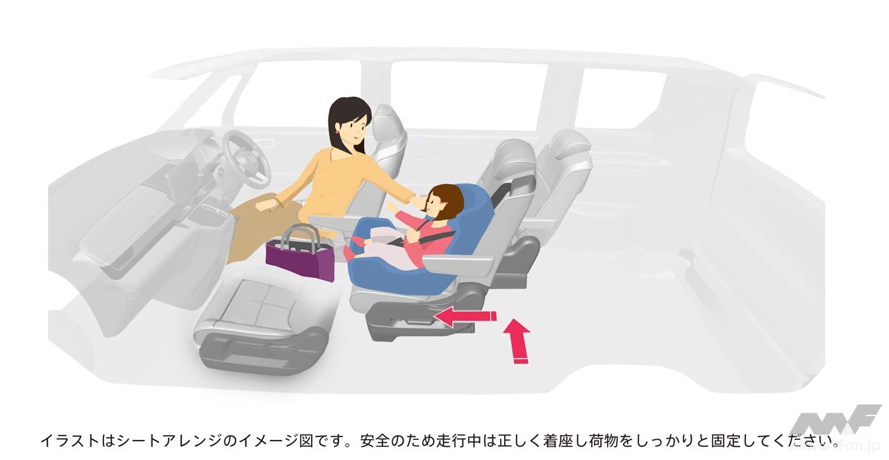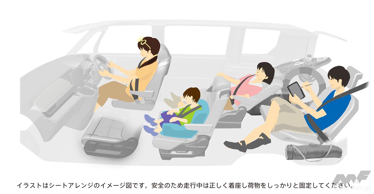 パッケージングの面では、家族の成長に合わせた多彩な使い方ができるよう、乗る人が自由に居場所を選べるシートアレンジを採用した。2列目シートは、前後へのロングスライドだけでなく左右にもスライドできる構造とされた。これにより、例えば小さな子どもは1列目から目の届きやすい場所に、成長とともに適度な距離感を持って座るなど、柔軟で自由な使い方が可能となる。3列目シートは、好評を得ている床下収納はそのままに、着座位置を高くし、前方のシート、ヘッドレストの形状を変更したことで開放的な視界を実現。シートクッションの厚みも増すことで、3列目においても快適な座り心地を実現している。