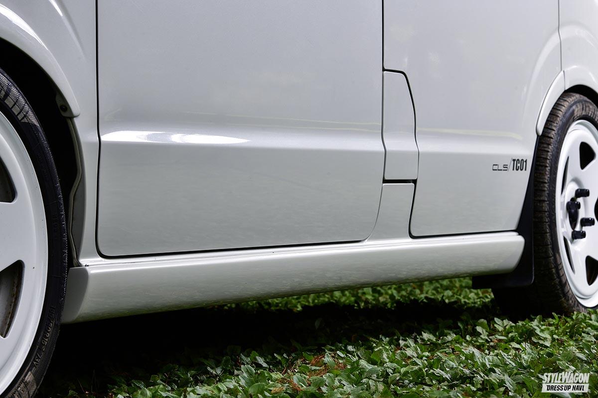 一方ローダウン向けは、開口部を限界まで広げたフロントバンパーを設定。かなり大振りに見えるのだが、実際は純正サイドステップの高さとほぼ変わらない。だから普段乗りもストレスなし。アーチを下げて視覚的に車高を低く見せるフェンダートリムを付ければ、理想的なロースタイルが手に入る。