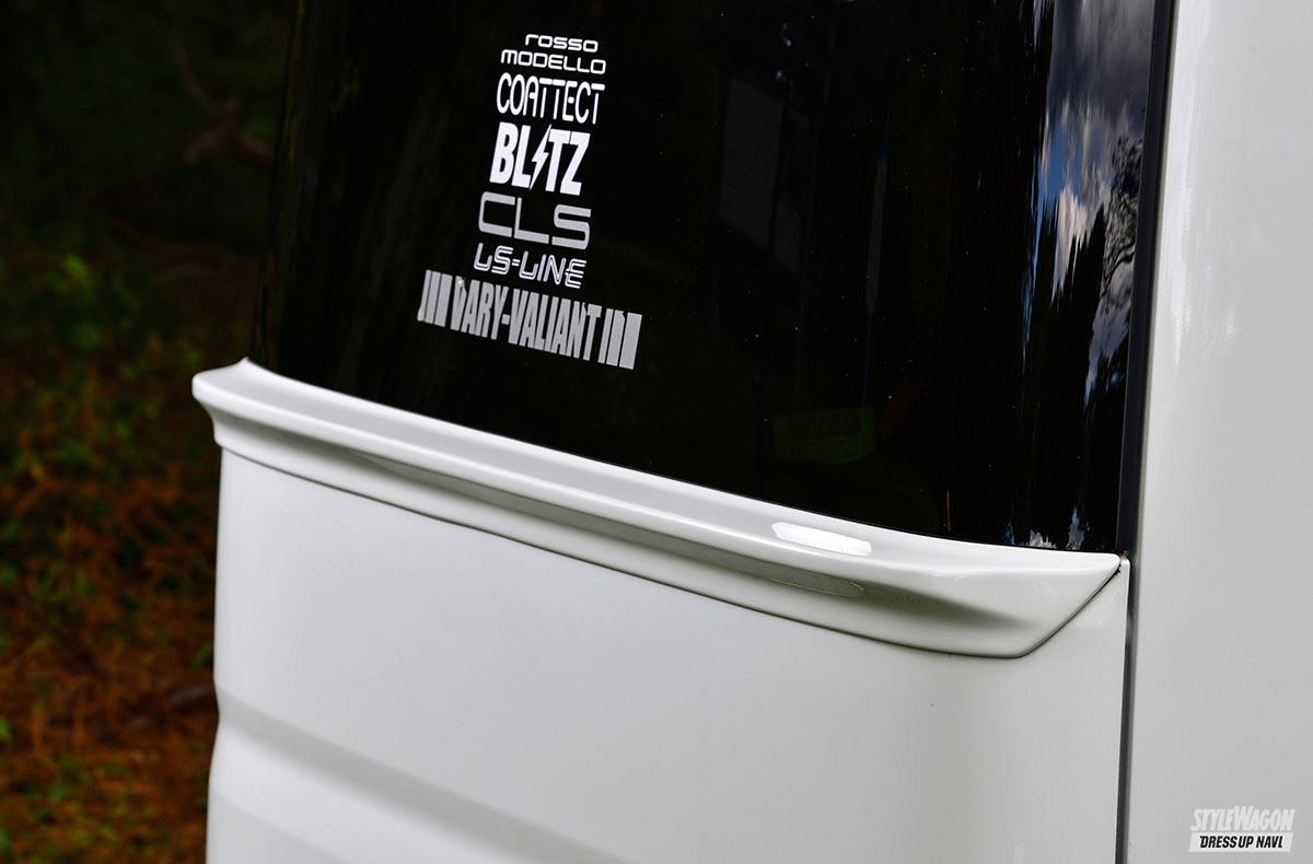 ハイルーフ用のリアルーフスポイラー。ツルンとしたリアゲートの上部に躍動感を与えてくれるオススメの逸品。