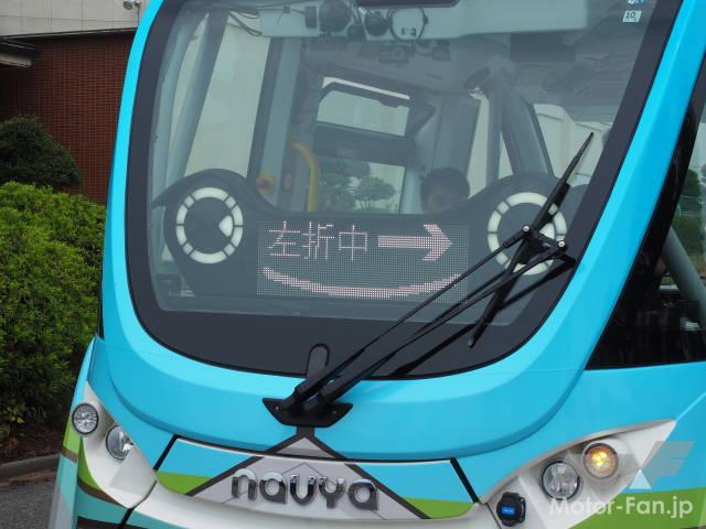本実証では、境町で定常運行している自動運転バスの1台に市光工業が開発したディスプレーを設置し、車両の状況に合わせて、「発進」「横断者あり」「停車」「右折」「左折」「あいさつ」などを意味するサインを文字や表情で表示する。通常はドライバーがジェスチャーなどで周囲の交通参加者に対してコミュニケーションを行っているが、外向けHMIが車両の状況を分かりやすく伝えることで、その役割の一部を代替する。表示するサインは、車内のスタッフが都度タブレットを使って操作する。市光工業とBOLDLYは、ドライバーの役割の一つである「V to Pコミュニケーション」に着眼している。