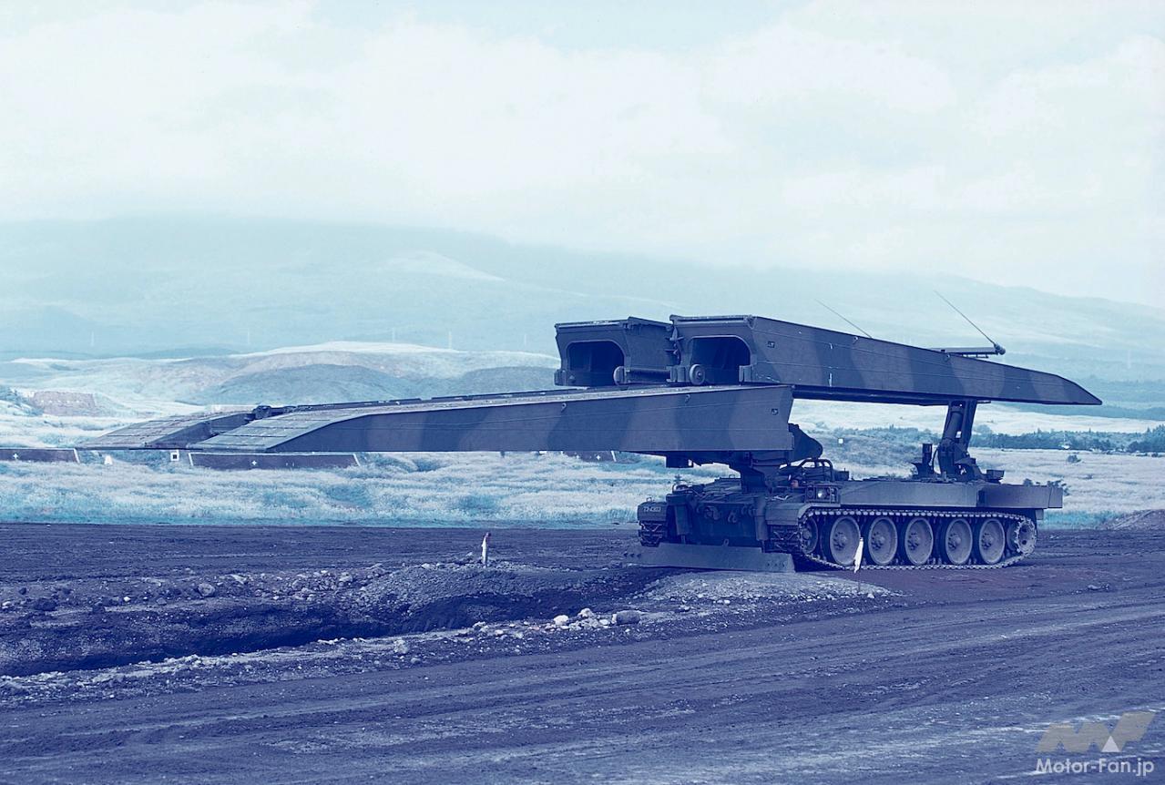 前進路が破壊されるなどして途絶した場合、迂回路を探すなどして、結果的に前進速度は落ちてしまう。進行が遅れると作戦全体に影響して勝てる局面を失うかもしれないから、前進は可能な限りスムーズに行ないたい……前置きが長いが、こうしたニーズで開発されたのが「戦車橋(せんしゃきょう)」などと呼ばれる支援特殊車両だ。その多くは先の大戦中に戦闘工兵が扱う多種類ある渡河機材のひとつとして開発されたもので、架橋戦車とも呼ばれる。従来の渡河作戦では、人力で仮設橋や船を転用した橋を架けていたが、戦車等の走行速度・性能向上に合わせてこうした工兵・輸送・兵站機材も機械化・機動化・高速化する必要があった。それでも当初の戦車橋は、強引に積んだ橋を必要な場所へ落とすだけのものだったらしい。そして、スタックした戦車を助け出す戦車回収車などとともに戦車橋は、機甲戦力システムのバックアップとなって進化する。