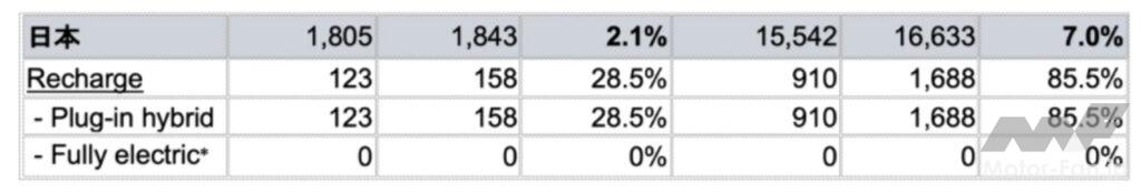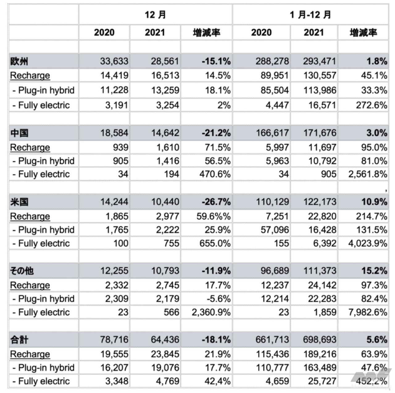 日本での販売台数(登録台数)は1万6633台となり、前年比で7%増加。12月単月の登録台数は1843台で、前年同月比2%の増加となった。日本でもリチャージモデルであるPHEVの販売が好調で、2021年は1688台を販売。通年の販売台数に占める割合は10.1%、前年比85%増加した。