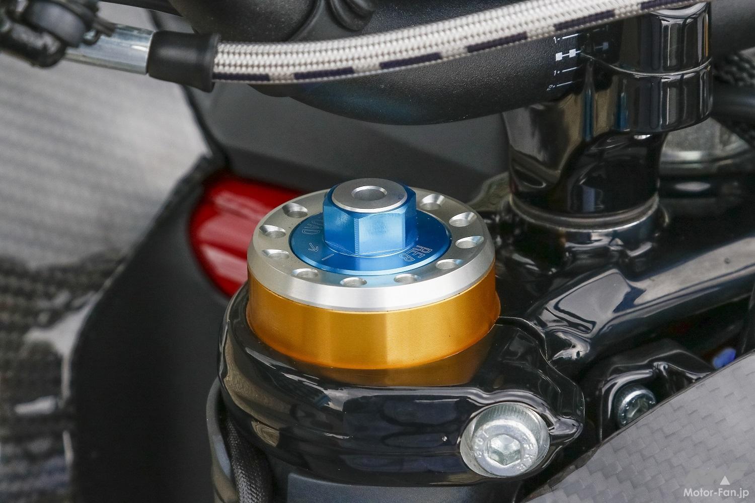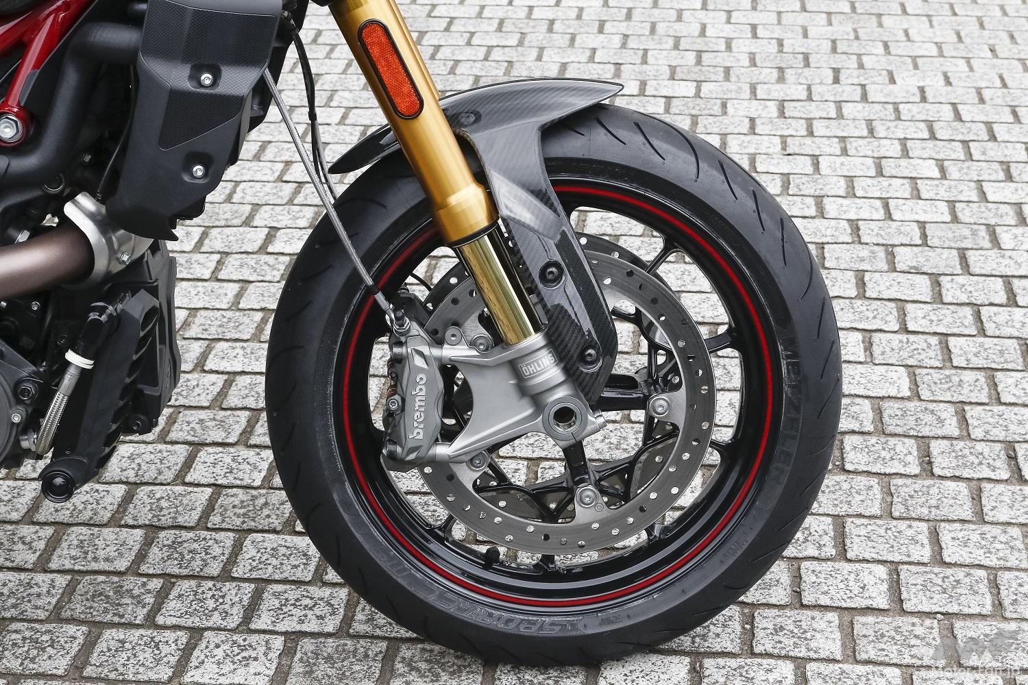 φ43mmオーリンズ製フロントフォークのボトムもカバーするショートフェンダーはカーボンファイバー製。フローティングマウントされたディスクローターはφ320mm。ラジアルマウントされた対向4ピストンの油圧ブレーキキャリパーはブレンボ製。