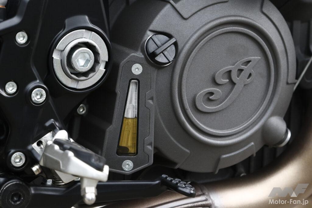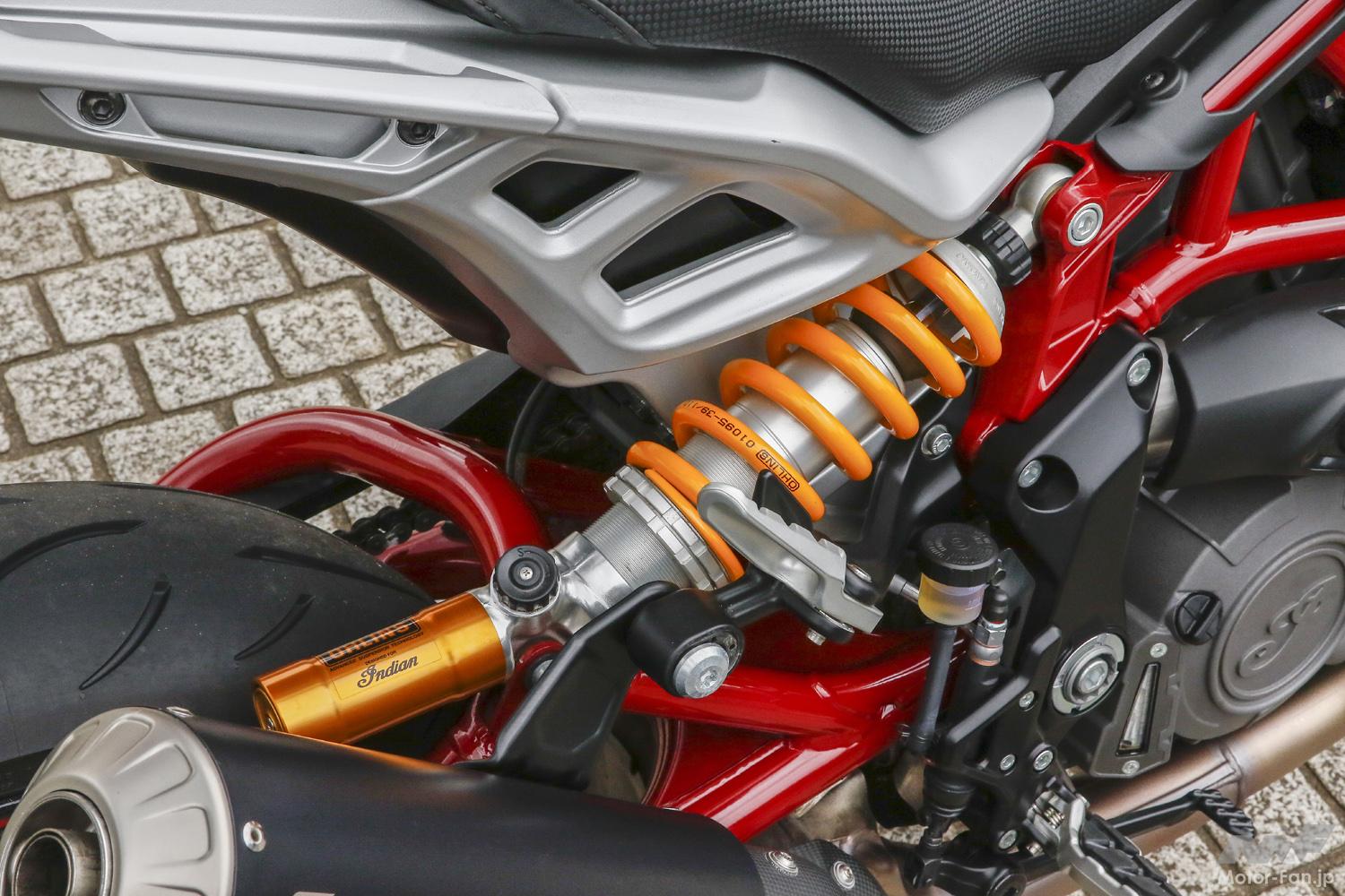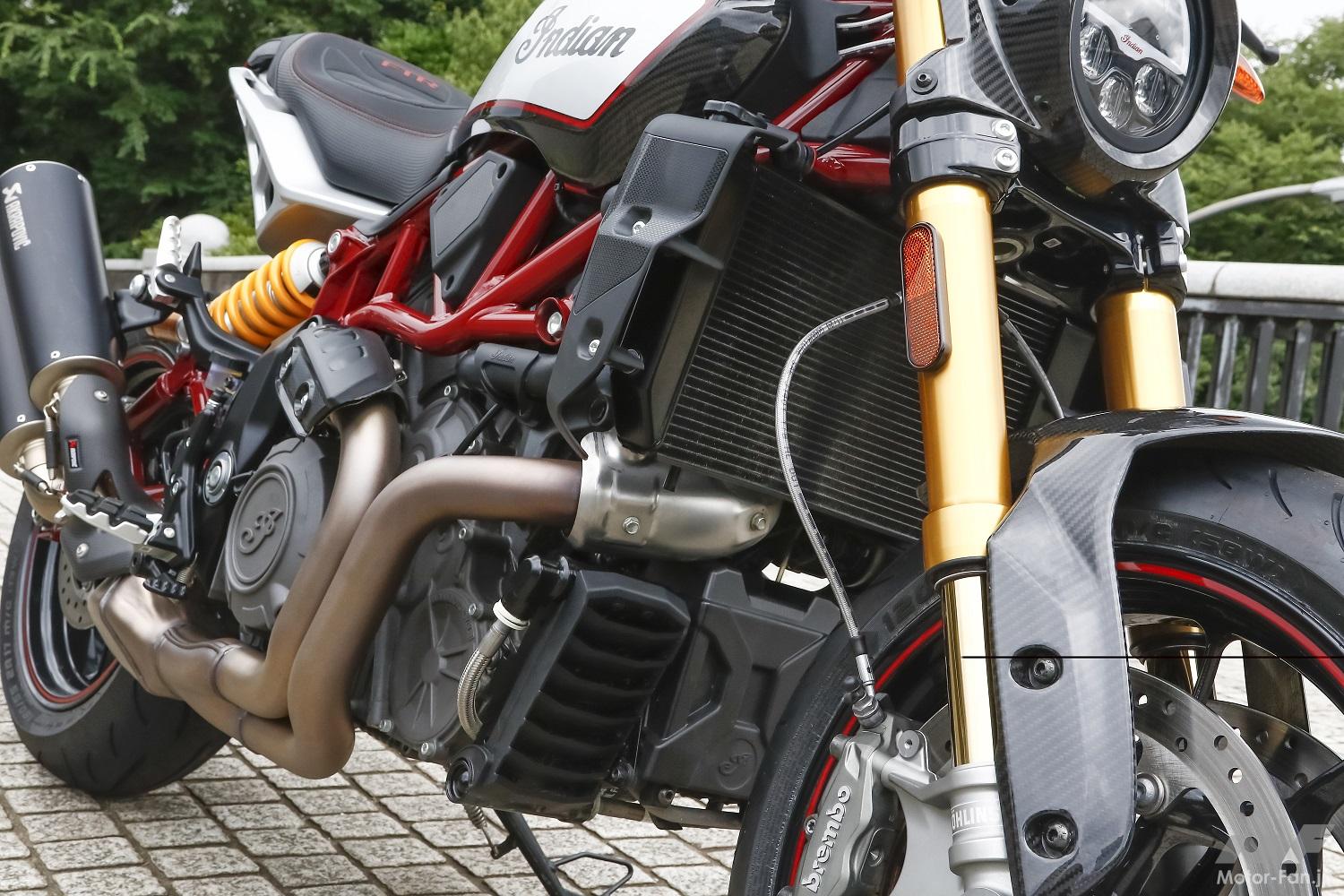 右側にオフセットマウントされたモノショックはインディアンのために専用開発されたオーリンズ製のフルアジャスタブル式。