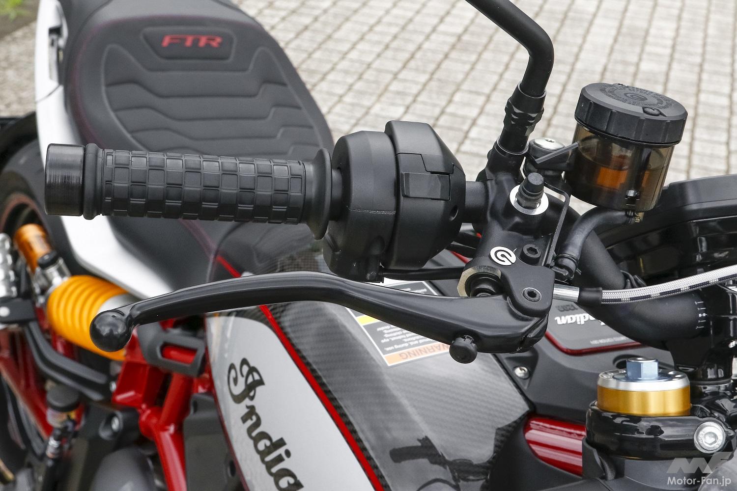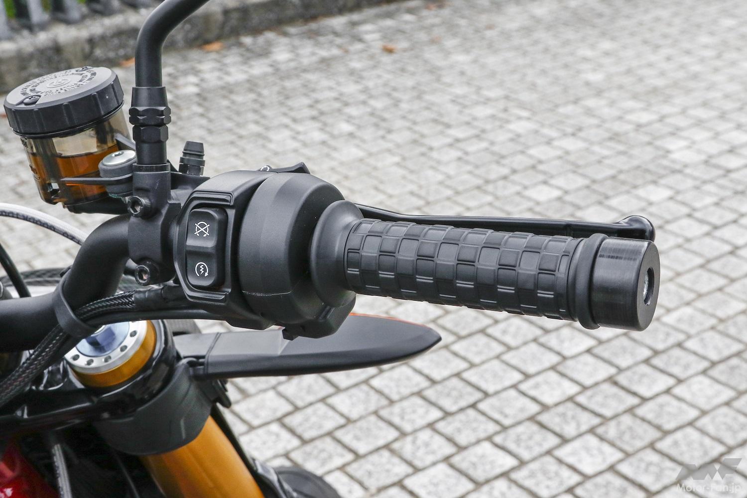 オーソドックスな手法でクランプされた黒いパイプバーハンドルは、アップされたテーパードタイプ。左手のクラッチはアシスト&スリッパー機能付きで操作力はとても軽い。