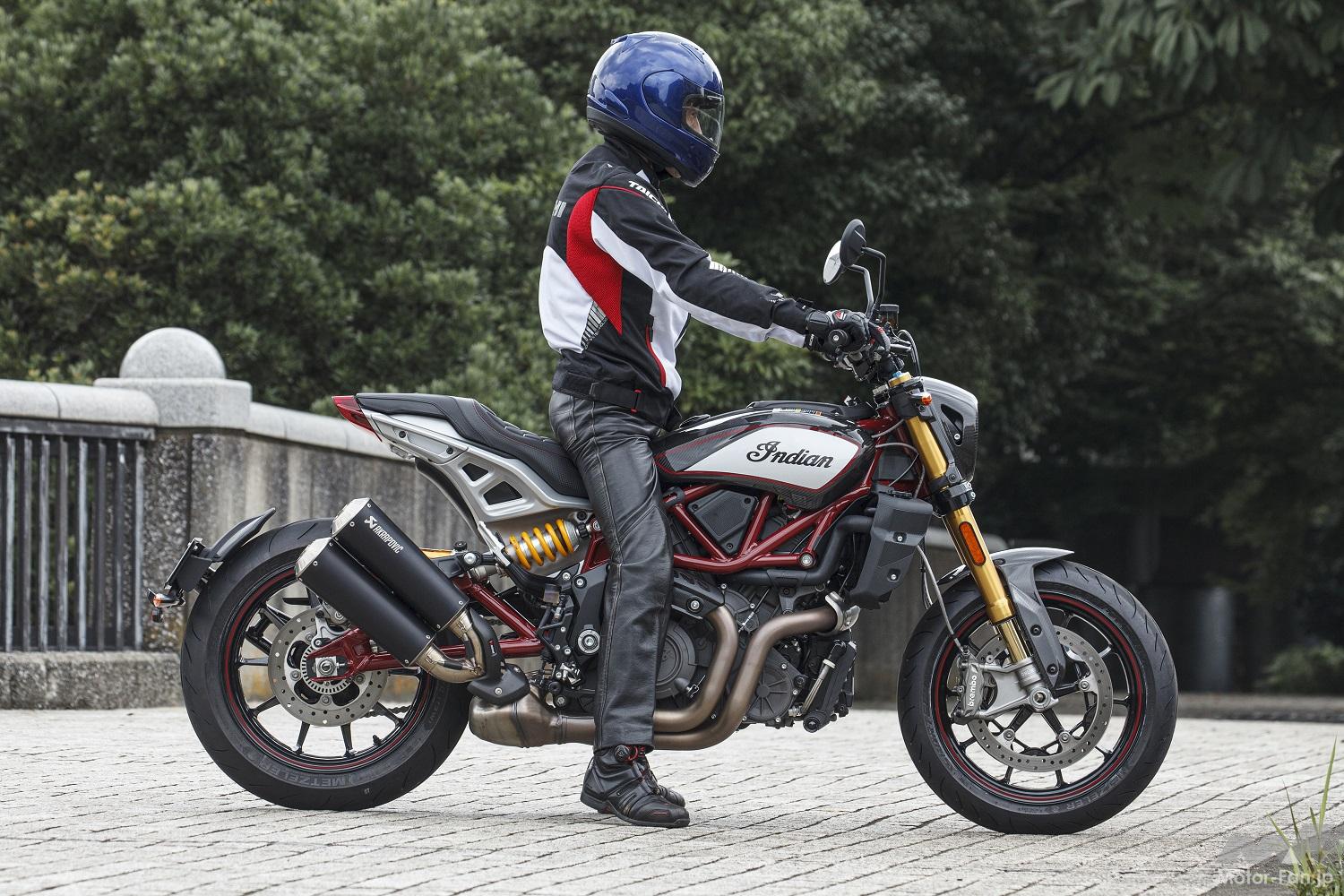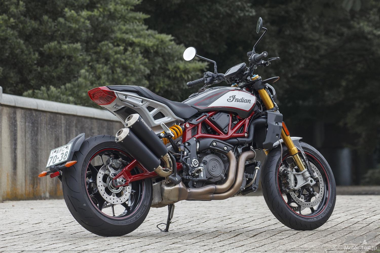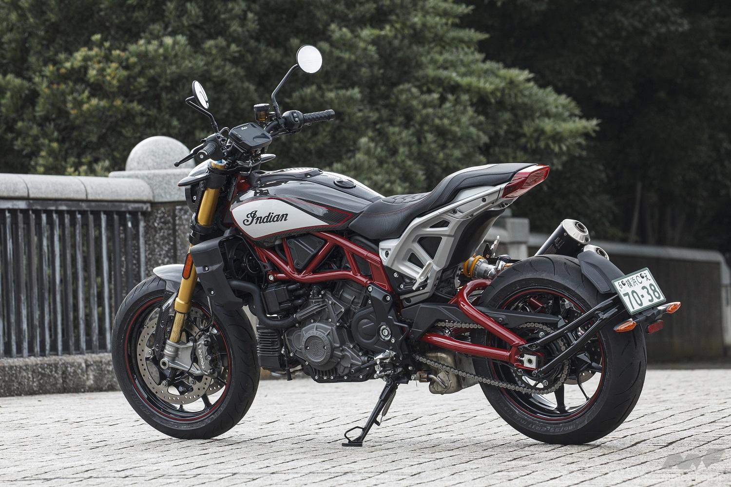 エンジンタイプ:水冷Vツイン 排気量(cc):1,203(73cu in) ボア x ストローク(mm):102 x 73.7 圧縮比: 12.5:1 燃料供給装置:電子制御燃料噴射システム(クローズドループ制御) スロットルボア(mm):φ60(デュアルボア) 排気システム:クロスオーバー・デュアルエ グゾースト(Akrapovic 2-into-1-into-2) 最高出力(hp):123 最大トルク(Nm/rpm):120/6,000 一次減速:ギアドライブ クラッチ形式:湿式多板(アシスト&スリッパー) ギア比(全体) : 1速 12.270 2速 8.341 3速 6.646 4速 5.639 5速 4.985 6速 4.278 二次減速:チェーンドライブ 減速比:2.647 サスペンション(前/後):Ohlins製フルアジャスタブル・テレスコピック・カートリッジフォーク / Ohlins製フルアジャスタブル・ピギーバッグ IFP ホイールトラベル(前/後mm):120 / 120 ブレーキ(前/後):Brembo製デュアル φ320mmローター 4ピストンキャリパー /Brembo製シングル φ260mmローター 2ピストンキャリパー タイヤ(前/後):Metzeler製 Sportec 120/70ZR-17 58W / Metzeler製 Sportec 180/55ZR-17 73W ホイール(前/後):Cast Black with Indian Motorcycle Red Pinstripe(17 in x 3.5 in / 17 in x 5 in) 全長(mm):2223 全幅(mm):830 全高(mm):1295 車両重量(kg):217 / 232(満タン) 最大許容重量(kg):430 シート高(mm):780 ホイールベース(mm):1525 最低地上高(mm):165 バンク角(度):45 キャスター(度):25,3 トレイル(mm):99.9 燃料タンク容量(L):13.0