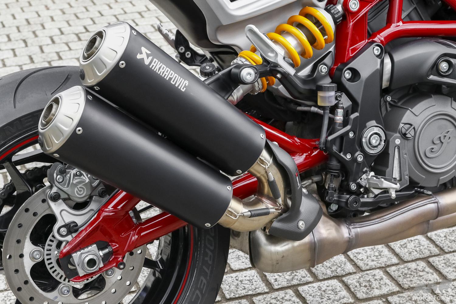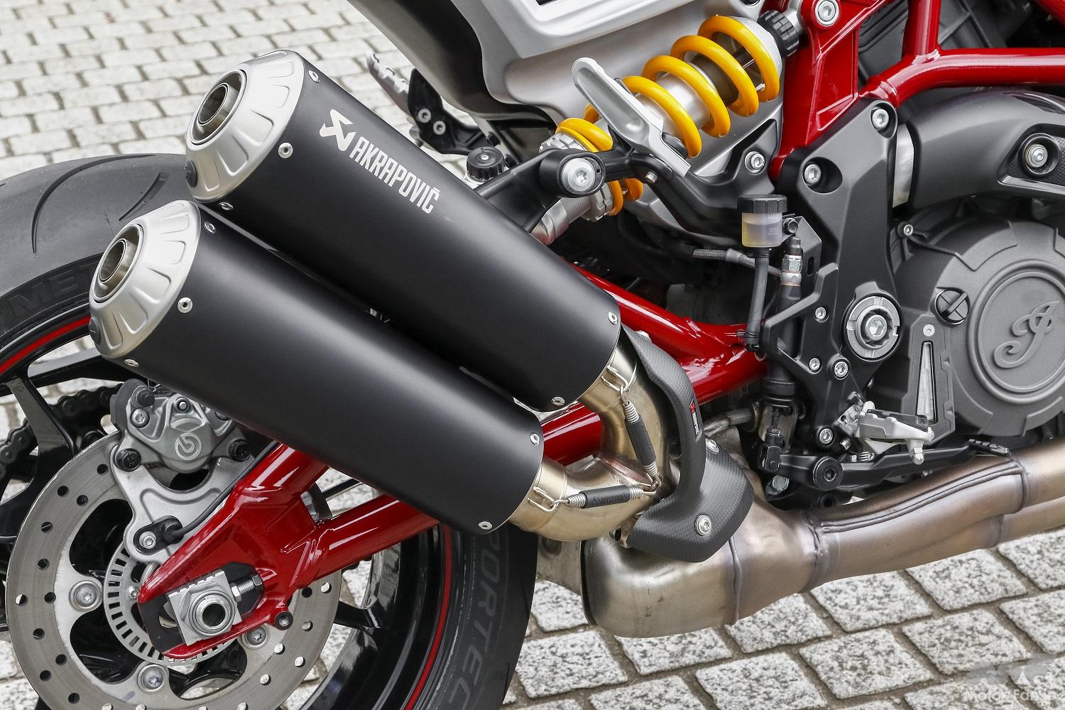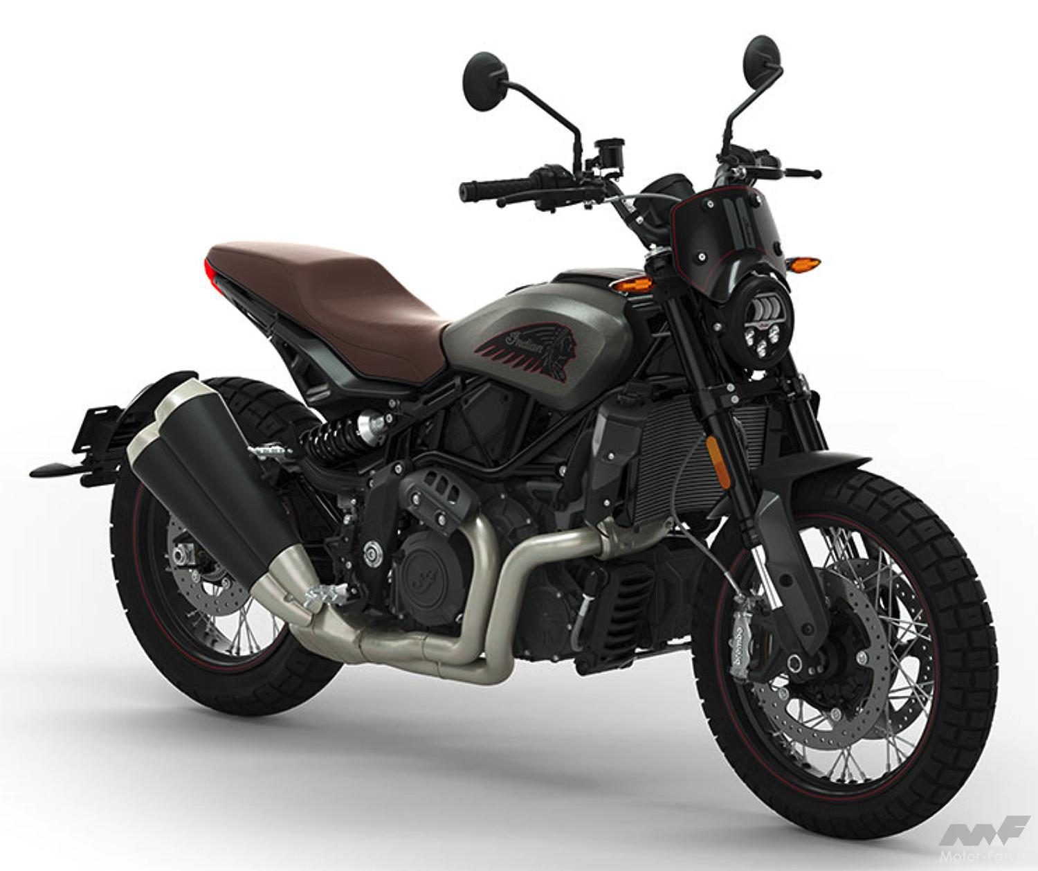 エンジンタイプ:水冷Vツイン 排気量(cc):1,203(73cu in) ボア x ストローク(mm):102 x 73.7 圧縮比: 12.5:1 燃料供給装置:電子制御燃料噴射システム(クローズドループ制御) スロットルボア(mm):φ60(デュアルボア) 排気システム:クロスオーバー・デュアルエ グゾースト(Akrapovic 2-into-1-into-2) 最高出力(hp):123 最大トルク(Nm/rpm):120/6,000 一次減速:ギアドライブ クラッチ形式:湿式多板(アシスト&スリッパー) ギア比(全体) : 1速 12.270 2速 8.341 3速 6.646 4速 5.639 5速 4.985 6速 4.278 二次減速:チェーンドライブ 減速比:2.647 サスペンション(前/後):Ohlins製フルアジャスタブル・テレスコピック・カートリッジフォーク / Ohlins製フルアジャスタブル・ピギーバッグ IFP ホイールトラベル(前/後mm):120 / 120 ブレーキ(前/後):Brembo製デュアル φ320mmローター 4ピストンキャリパー /Brembo製シングル φ260mmローター 2ピストンキャリパー タイヤ(前/後):Metzeler製 Sportec 120/70ZR-17 58W / Metzeler製 Sportec 180/55ZR-17 73W ホイール(前/後):Cast Black with Indian Motorcycle Red Pinstripe(17 in x 3.5 in / 17 in x 5 in) 全長(mm):2223 全幅(mm):830 全高(mm):1295 車両重量(kg):217 / 232(満タン) 最大許容重量(kg):430 シート高(mm):780 ホイールベース(mm):1525 最低地上高(mm):165 バンク角(度):45 キャスター(度):25,3 トレイル(mm):99.9 燃料タンク容量(L):13.0