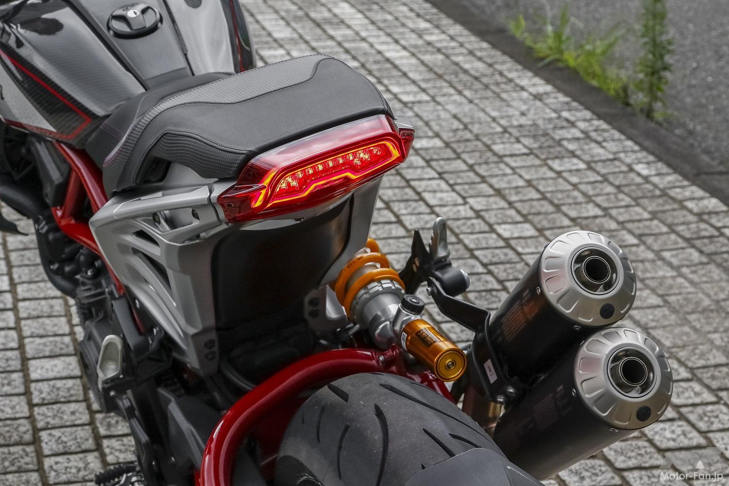 シートエンドでスッキリと綺麗なフィニッシュを魅せるLED式テールランプ。ウインカーランプは、ナンバープレート直下の左右、写真には映っていない低い位置にセットされている。