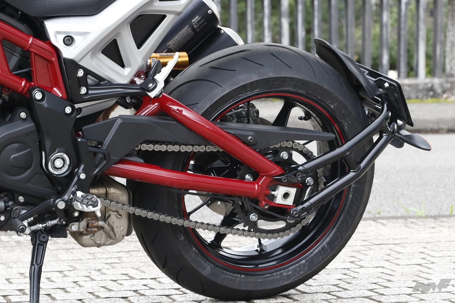 トラス構造のスチールパイプ製スイングアームはフレームと同様の赤色塗装。アームエンド左側にナンバー及びショートフェンダーを支持する黒いパイプステーが組み付けられている。